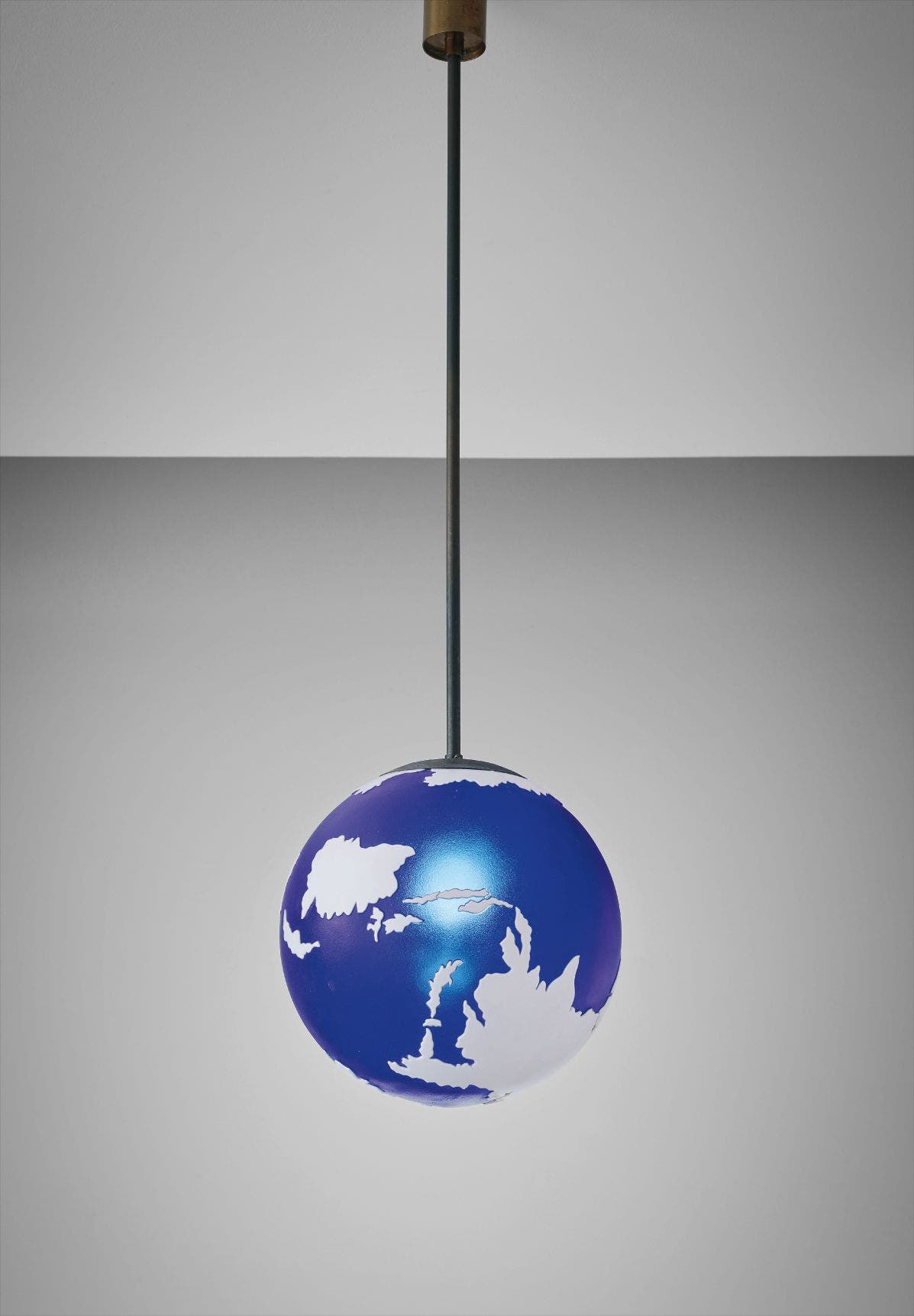 As a former master glass maker, Chiesa was a prolific lamp designer. From the timeless elegance of the essential forms he elaborated romantic constructions and even mechanistic fantasies. He produced some of the most iconic lamp designs of Fontana Arte, such as the globe-lamp designed for the Cosulich Shipping Company of Trieste, to which the present ceiling light is closely related.