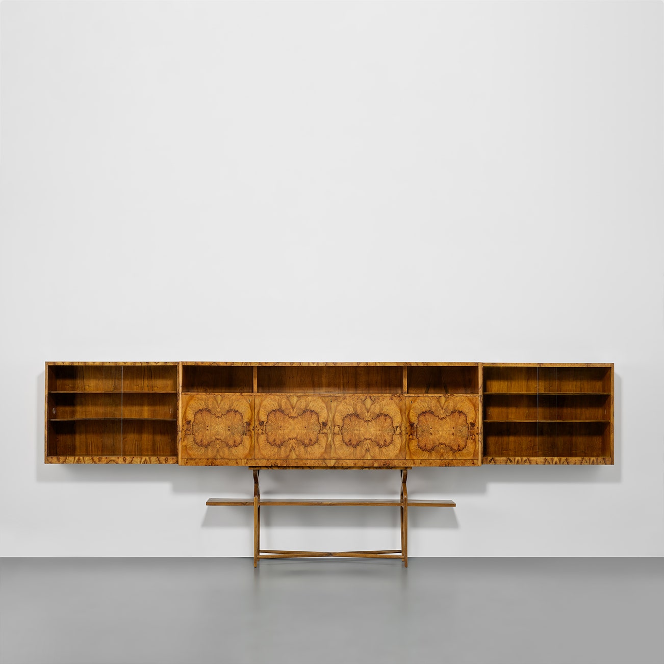 Burr walnut-veneered wood, walnut, glass, mirrored glass, brass.