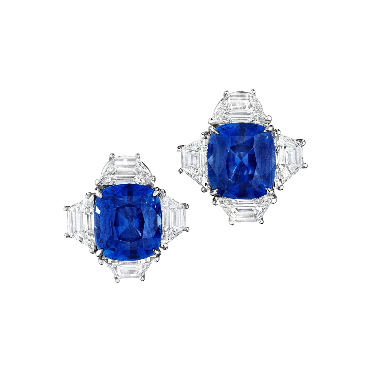 Each set with a cushion-shaped sapphire weighing 6.60 carats and 6.63 carats respectively, surrounded by four trapezoid-shaped diamonds, mounted in platinum, posts with clip back fittings, signed Piranesi.