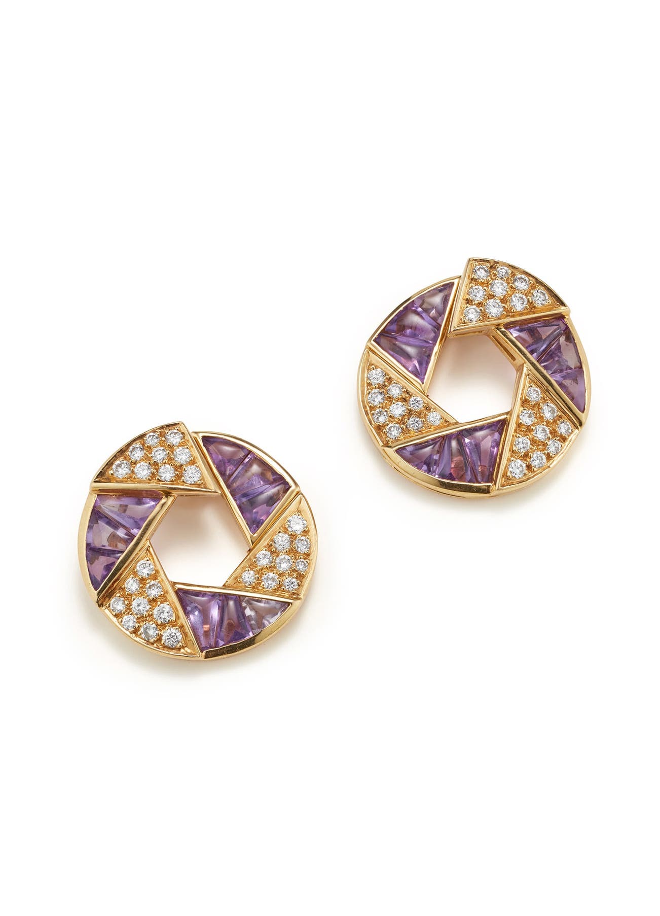 A Pair of Diamond, Amethyst and Gold Earrings
