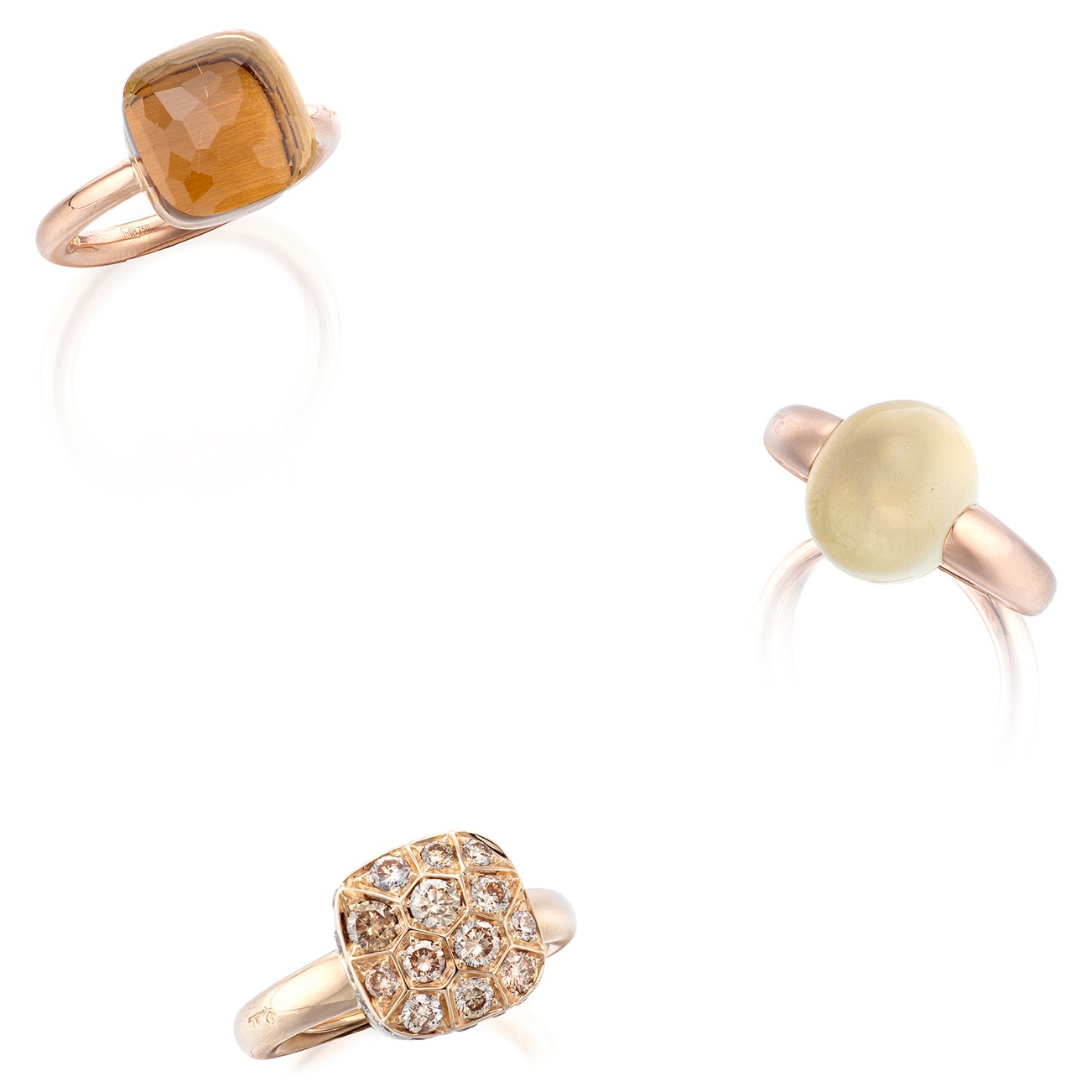 The first ring set with brilliant-cut diamonds of brown tint; the second ring, set with a cushion-shaped citrine; and the third ring, set with an oval cabochon quartz, all mounted in pink gold, signed Pomellato, Italian assay and maker's marks, first two rings are numbered and with Russian hallmarks, size 6½, 6½ and 7¼ respectively.