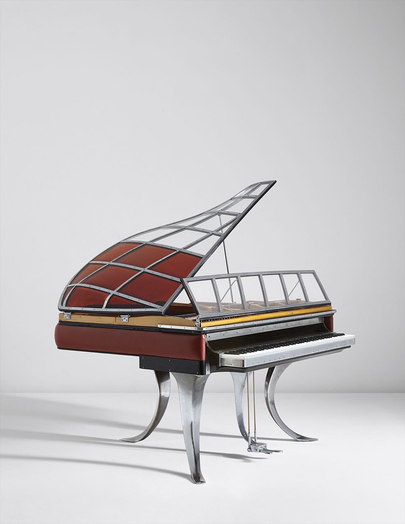 Chromium-plated steel, Plexiglas, painted wood, wood, leather, acrylic keys, ebony, piano wire.