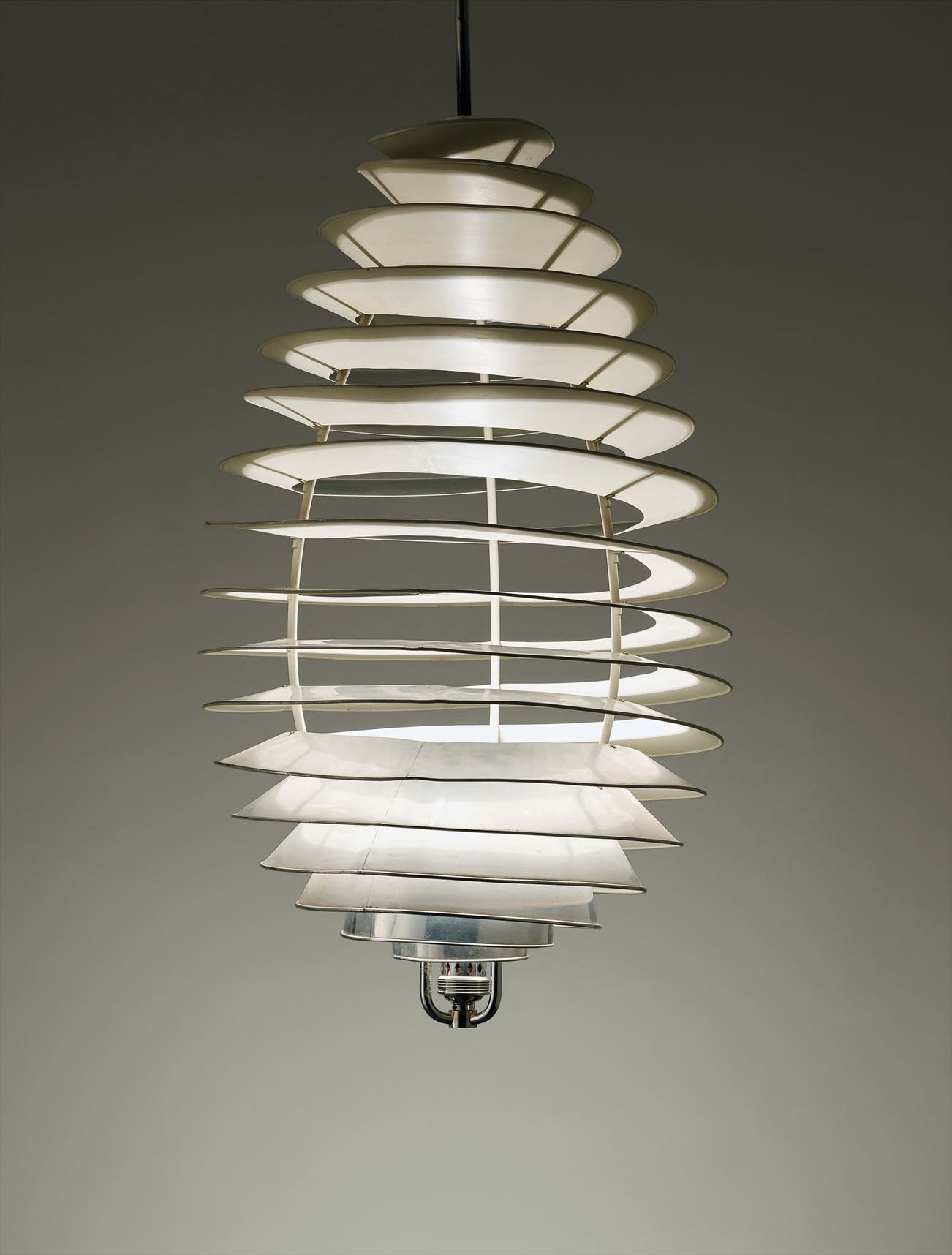 Henningsen’s design of a spiraled section of painted metal appears as an unbroken winding line but is in fact composed of many individual sections. In comparing the ceiling light to some of his other well-known models, Henningsen focused on its qualities of light reflection: "The principle in this lamp is much more the same as in the PH lamp and the Globe per se, but the light ray direction is reminiscent of the way it shines outwards from the Globe. The shape is geometric and the light strikes all the parts of the spiral, which are illuminated at the same angle, reflecting it out into the room in the same way". The quality and direction of refracted light was always of primary importance to Henningsen, and his design decisions were informed by this value with great success. Unlike the task-oriented purpose of his smaller lights, the ‘Spirals’ were intended to illuminate grand spaces, and to interact with the architecture in a manner that was as expressive as it was functional.