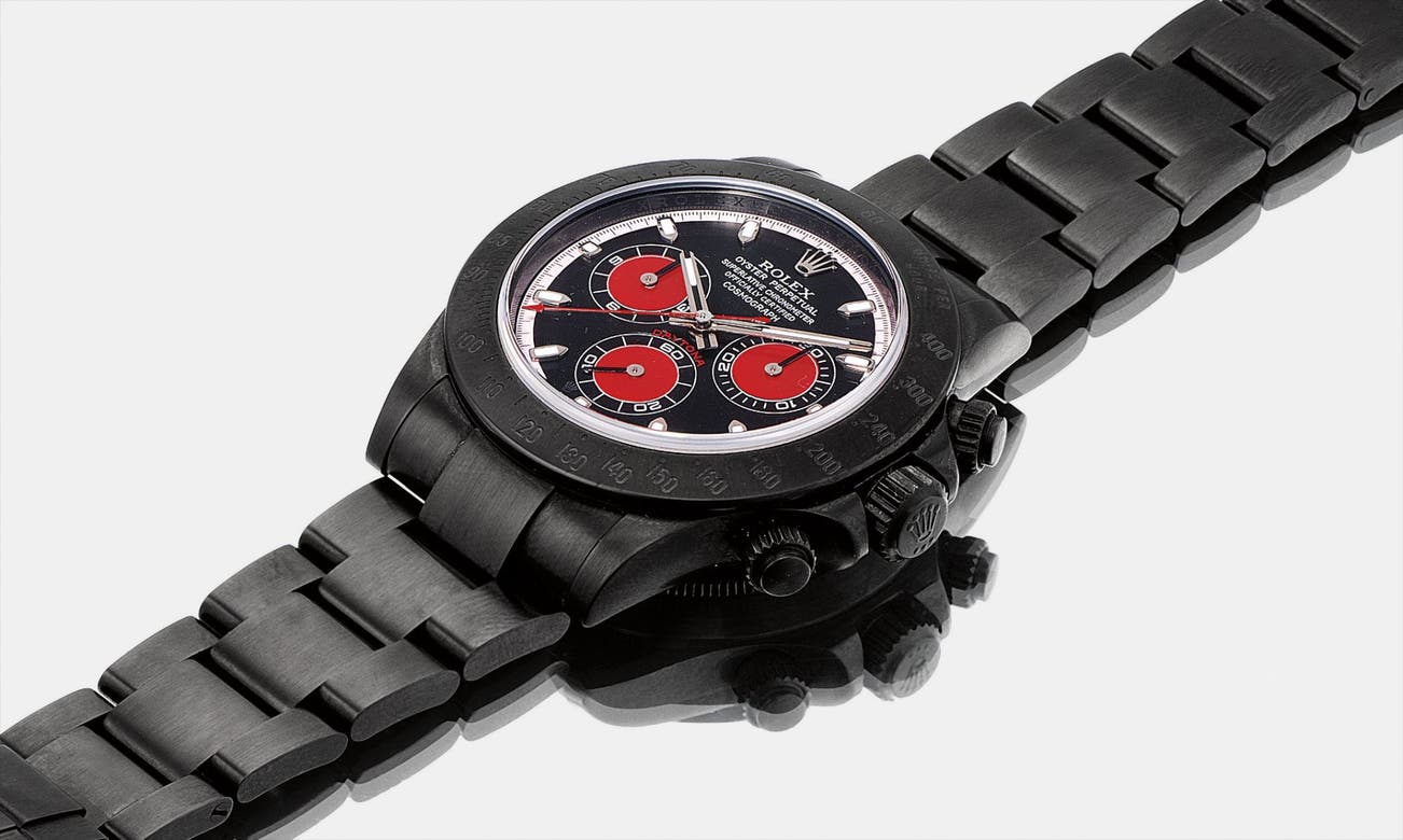 Pro-Hunter specializes in personalizing a range of limited edition Rolex sports watches. They apply an anti-reflective ‘diamond like carbon’ coating on the case and is available in three unique styles: original, matte and stealth, giving the watch a sleek and ultra-modern look. The present watch is finished with an anti-reflective DLC coating and the dial is coloured in black with contrasting red subsidiary dials, much inspired by the rare classic Paul Newman wristwatches. The case back is engraved with the Pro-Hunter issue number 032 and the watch is part of a limited series of 100 pieces only. The present lot is offered in like new condition and complete with all accessories.