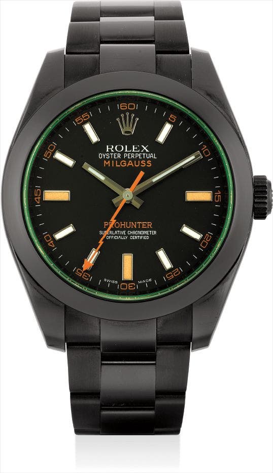 The modern re-edition of one of Rolex's most technical timepieces, the new Milgauss enjoyed outstanding success with the public. The most obvious connection to the vintage model is the lightning-shaped seconds hand, visually synonymous with the model. The present specimen is a blacked-out version of the celebrated reference 116400GV, characterized by the green tinted crystal. The surprising harmony that is established between the orange details of the dial and the green crystal is furthermore amplified by the black PVD coating, creating a remarkable aesthetic impact.