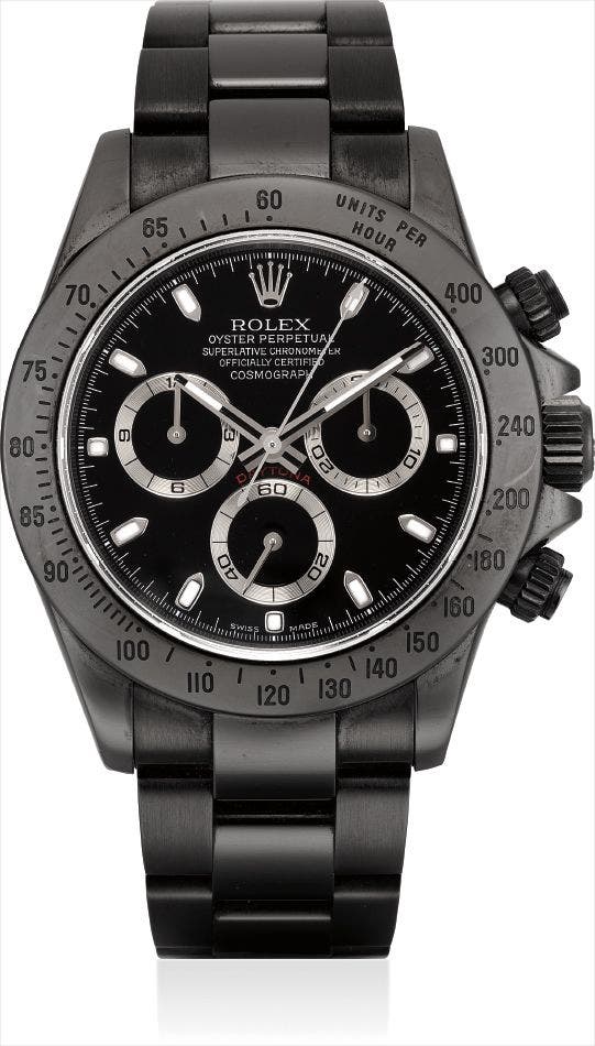 A very masculine and attractive modification of the Daytona Cosmograph, the present piece is offered complete of all its original accessories. It furthermore comes accompanied by an additional bezel with white graphics, allowing the owner to dramatically modify the look of the piece with one simple operation.