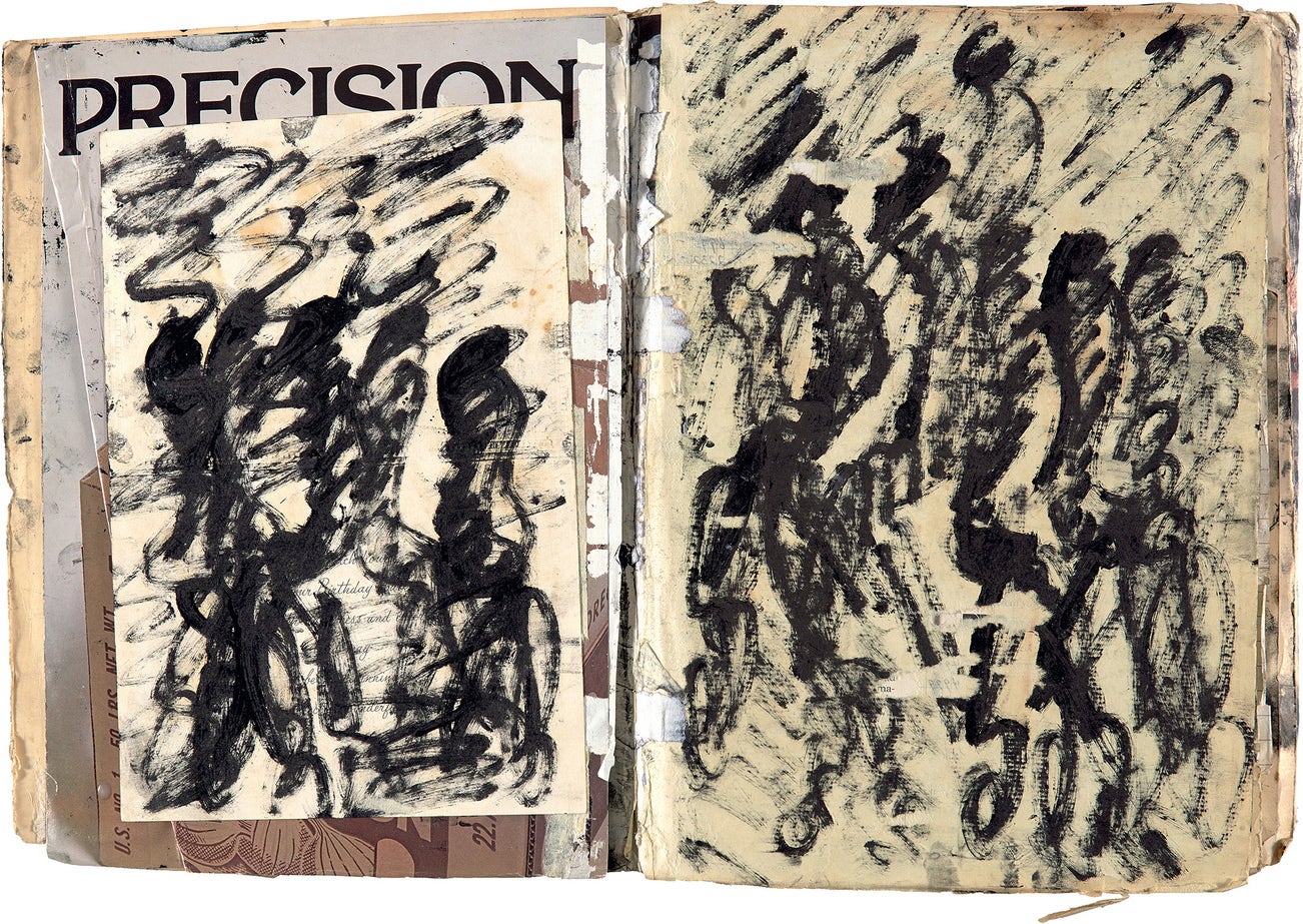 Acrylic paintings on various ephemera, collaged to sheets of a bound book.