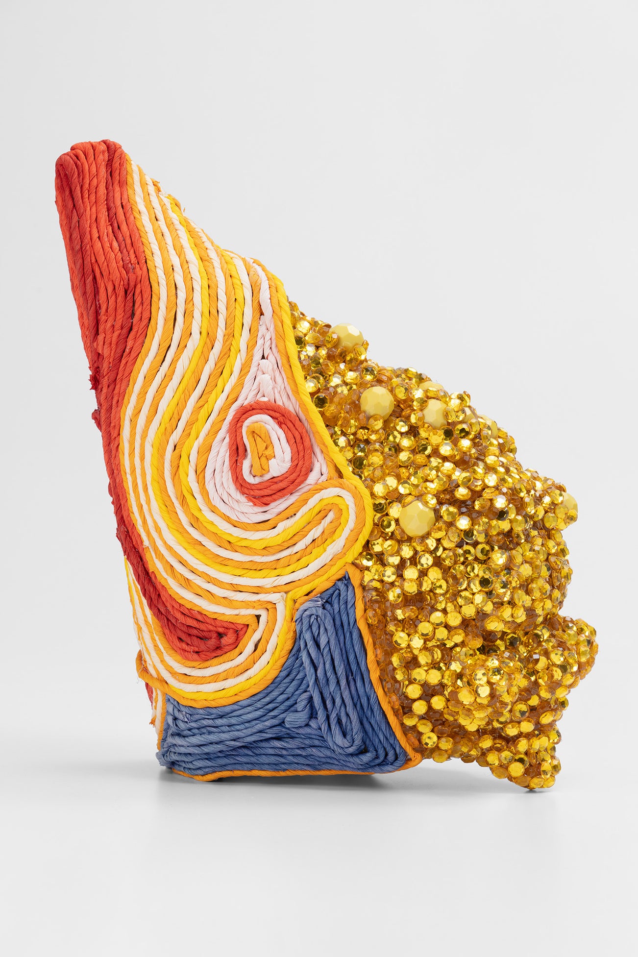 cardboard, plastic rhinestones, hand-rolled crepe paper, glue and beads