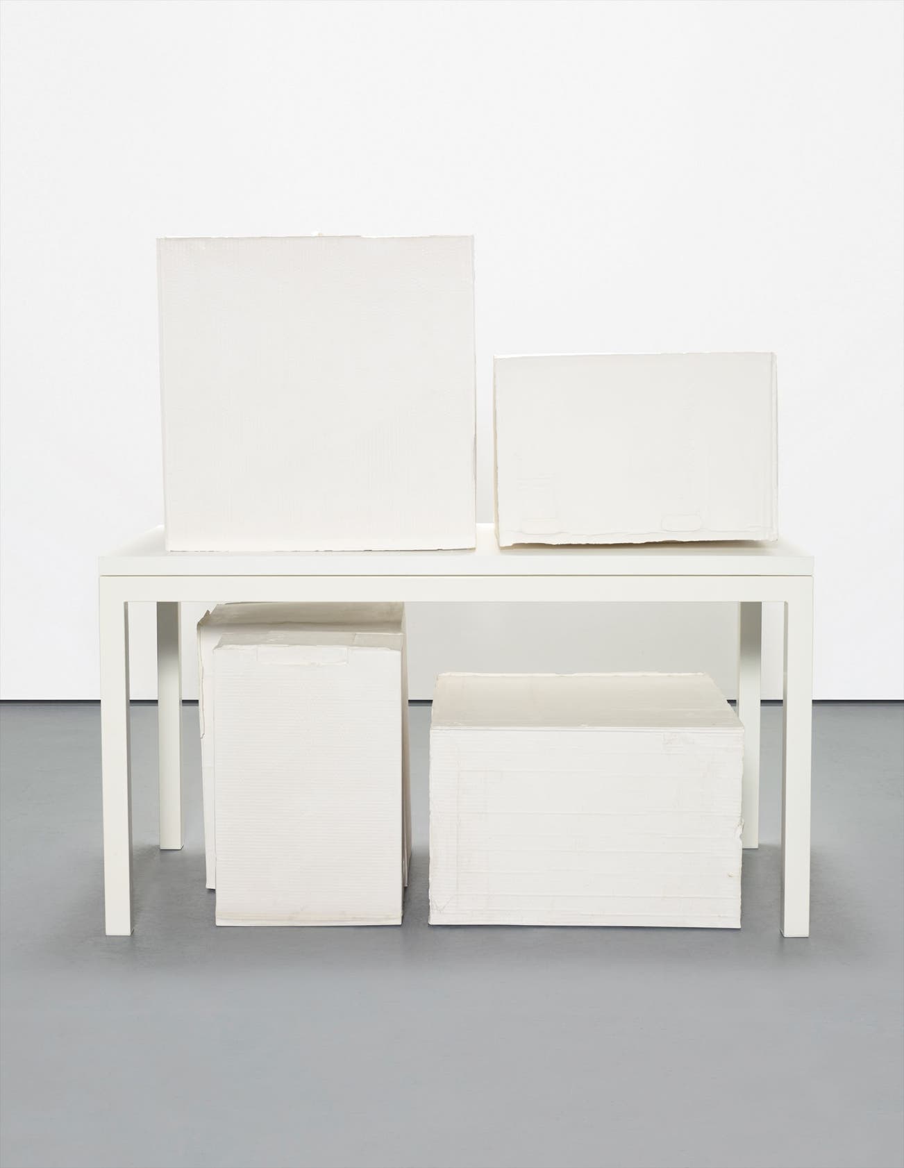 Block from 2005 is directly related to this installation and was exhibited concurrently in Gagosian Gallery’s London space. Block encompasses the same pathos and intimacy which these boxes at the Tate came to represent. The liminal space of the original material of the box, that slip of cardboard between the outside world and those objects contained within, became, in essence, the skin of another being. The relics of her and her mother’s personal history packed inside the original boxes are thus transformed into the physicality of her work. The boxes, loaded as they were, reflected the direct impressions of those objects which they formerly held. In casting the boxes from the interior with plaster, the same possessions are thus reflected in these finished sculptures. There is a deeply personal reflection embodied within these beautifully post-Minimal white boxes. Interestingly, Whiteread’s sculptures such as Block are not as physically imposing and immediately emotive as some of those titanic Minimalist works, but rather unfold gradually and gracefully before the viewer. Those emotional histories become manifest in her sculptures, new boxes packed up, moved out, and discarded, and yet, in their physical presence, immortalized and memorialized.