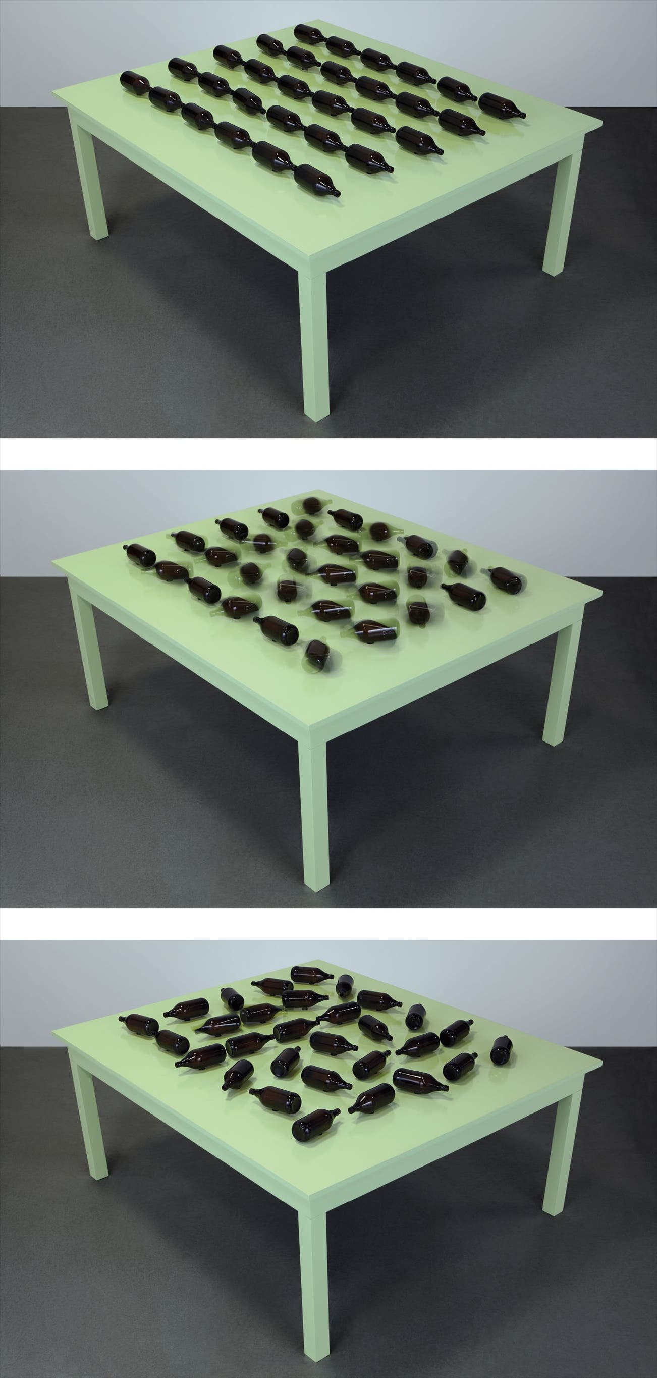 The present lot Synaptic Caguamas is a brilliantly absurd kinetic sculpture in the shape of a Mexican “cantina” bar. Whirling on top are 30 distinctively “Caguama” (32 oz) beer bottles that have been motorized. The bottles spin on the table according to patterns generated by what the artist describes as “cellular automata algorithms that simulate the neuronal connections in the brain.” Every few minutes the bottles stop in an apparent about face, and though one may suspect that this is evidence of a choreography set on loop, it is, in fact, the moment the algorithm chooses a new pattern of movement; one that will never be repeated. Synaptic Caguamas alludes to the tireless ability of the algorithm to find new permutations of movements, while perfectly demonstrating Lozano-Hemmer’s ability to integrate notions of the infinite, mathematics, and thought with the absurd imagery of alcohol, cantinas, and parties.