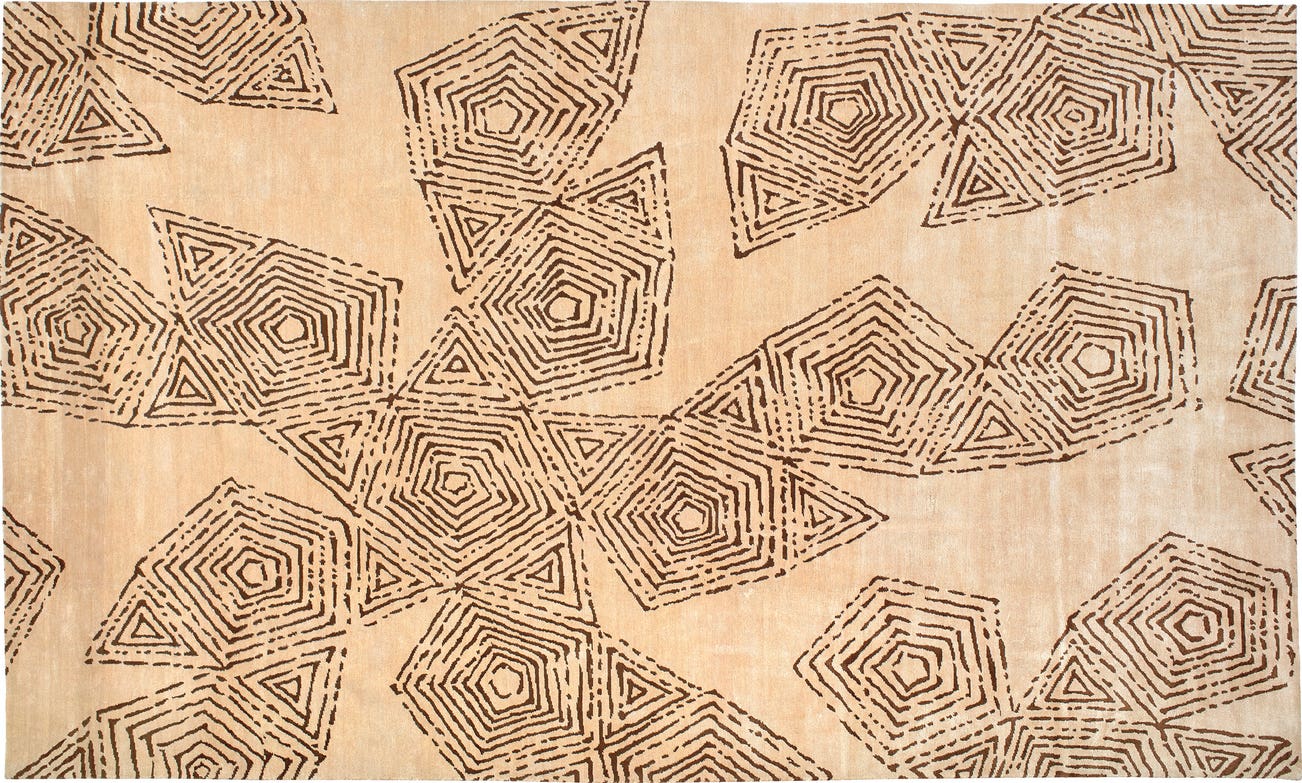 As an architect, Rafael Moneo’s work has been profoundly influenced by history, art and philosophy. Moneo has described his interest in the architectural canon and a historically rooted base of knowledge and solutions from which contemporary architects could draw. ‘’I would say that to put architecture in the chain of history, to be able to interpret and understand why we are where we are, is quite crucial.’’ This artistic interpretation of the Golden Section for Moneo’s carpet design can be attributed to this end. Moneo drew from both the description and illustrations of an extract ‘La Pratica della Perspettiva di Monsignor Daniel Barbaro’, the 16th century treatise on perspective by the architect, writer and patron of Andrea Palladio, Daniele Barbaro. The chosen passage describes, '…a body of 12 surfaces with 5 sides, and from the body of 20 triangular surfaces, originates another body which contains the flat surfaces, sides and angles of the mentioned body. This is because it is formed by 20 pentagons and 30 sides of the dodecahedron, and by 20 triangles with 30 sides of the icosahedron.' The complex and curious 32-sides polyhedron explained and illustrated by Barbaro has as its foundation, the ‘Golden Section’ and thus forms the basis of the pattern making up the carpet design. It is made up of a series of pentagons and triangles, each shape mirrored with a sequence of smaller shapes and varying line density to simulate the perspective of protruding three-dimensional forms, reminiscent of natural salt crystals viewed under a microscope.