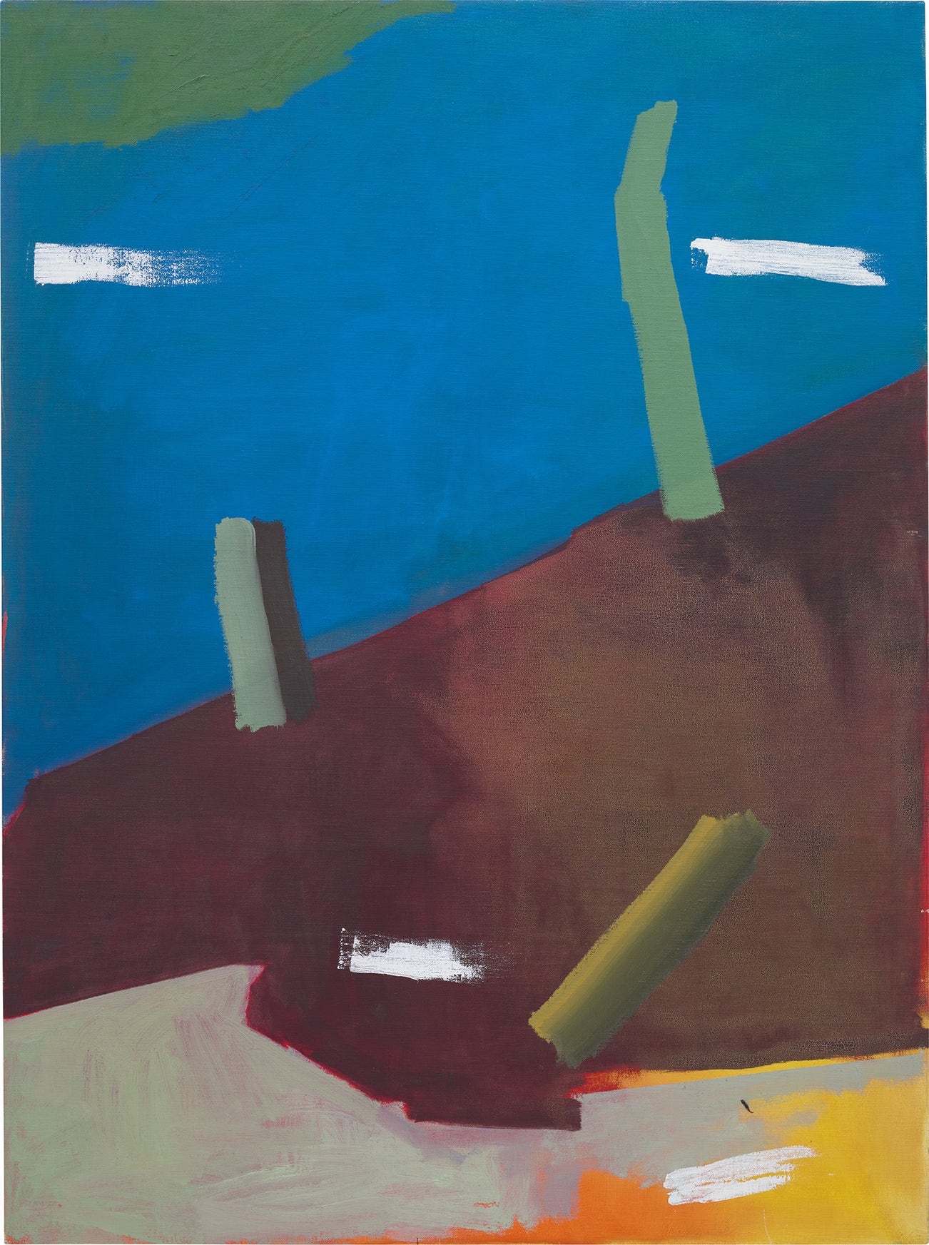 With its distinct planes of colour and its sparse gestural marks, Hellepoort, 1985, conveys Raoul de Keyser’s meditative visual language, hovering between landscape painting and instinctive abstraction. The title Hellepoort, signifying ‘Hell Gate’ or ‘Gates of Hell’ in Dutch, suggests a resonance with Auguste Rodin’s similarly titled sculptural group, depicting a scene from Dante Alighieri’s Inferno on a monumental scale. Yet, de Keyser’s Hellepoort eschews realism or any clear subject matter, and instead presents a congregation of floating elements drenched in varyingly bright hues. Split between convincing expanses of blue, maroon and light yellow, the canvas seems to have been initiated and then worked on again – numerous times and systemically – resulting in an intuitive surface boasting three monochromatic planes, and a collection of slim, layered brushstrokes. Esoteric, concise and eloquent, Hellepoort exemplifies one of the subtle shifts that de Keyser’s practice underwent in the 1980s, whereby colours became increasingly exuberant, and the artist’s experimentation with space more complex. Seven years later, he would participate in the highly acclaimed documenta IX, 1992, curated by Jan Hoet – and subsequently become a household name in Belgium.