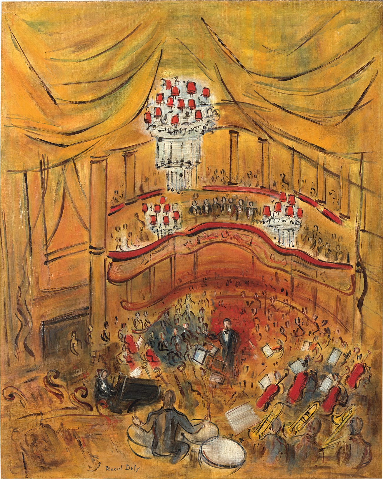 Dufy is known for his colorful series of works depicting leisure activities and landscapes. He revisited certain themes during his lifetime, including those from the French Riviera, opera, seaside, sailing regattas, horse racing and musical events. As Gertrude Stein once admirably said, "Raoul Dufy is pleasure itself." The joy and lightness conveyed throughout Dufy's work are not only due to the subject matter but the artist's distinct style and exceptional use of color. Dufy was often considered a follower of the two French eighteenth-century artists Jean-Antoine Watteau and Jean-Honoré Fragonard. In 1952, Dufy went on to win the International Grand Prix for painting with his commission for the 26th Venice Biennale.
