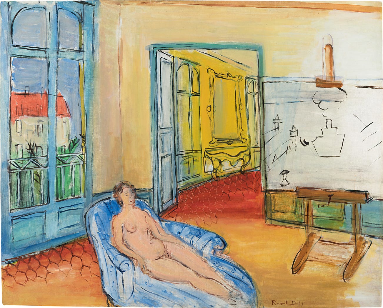 Nu dans l'atelier de la place Arago à Perpignan, from the same year, 1946, belongs to a series of nudes depicted in Dufy’s study, begun decades prior in 1909. Though this subject did not play a major role in Dufy’s oeuvre, it served as a means of uniting two traditional themes conceived in a distinctly modern aesthetic - the nude and the artist’s studio - and marked the development of his style as he returned to this model throughout his career. The studio acted as a representation of the mental space in which the artist’s work occurred, and, fittingly, the scene depicted in Nu dans l'atelier de la place Arago à Perpignan is composed of bright colors and is bathed in light from the large window at the left side of the composition. A tenderly portrayed, relaxed woman reclines on a chaise-lounge at the center, while the easel to her right holds an unfinished painting, suggestive of the artist’s presence in the room. The window overlooking the town visually increases the dimensions of the studio, endowing it with an airy and spacious feeling characteristic of Dufy’s interiors, and his studio in the Place Arago in Perpignan, where he worked from 1946-51, depicted in the present work, is the apotheosis of this theme.