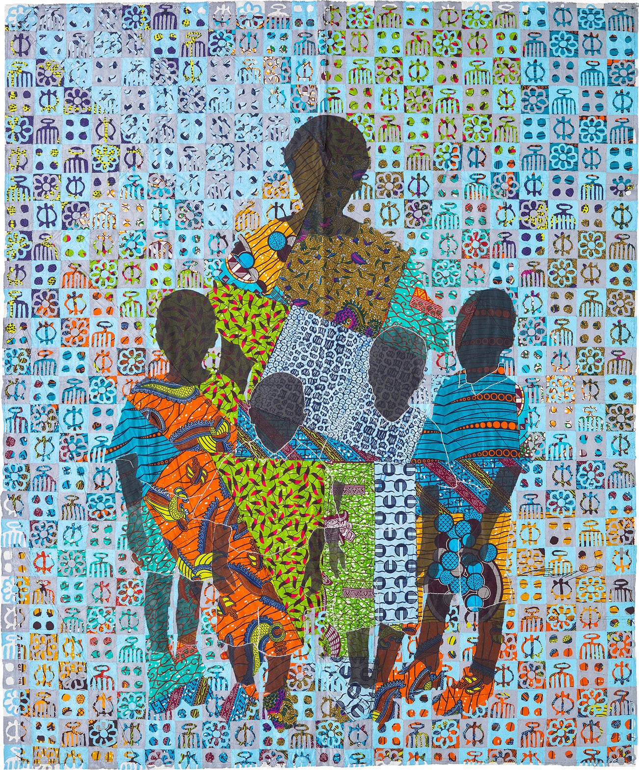 acrylic, African wax, embroidery and printed fabric collage on unstretched canvas