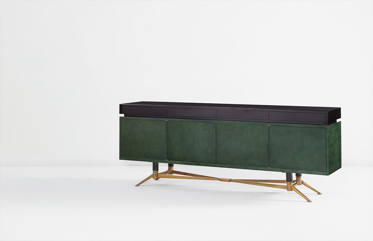 Raphaël Raffel, best known as Raphaël, was born in Paris in 1912. Much like some of his contemporaries André Arbus, Jacques Adnet and Jules Leleu, Raphaël found inspiration in the décor of the eighteenth century. In the 1940s, his work became synonymous with the status of the “ensembliers-décorateurs,” or a true designer of an interior space in its totality. In this way, Raphaël was not only a creator of singular items of furniture, but he controlled the decoration of walls, the lighting, and every other element on display within an interior space. By the 1950s Raphaël was well-established as a collaborator with other French designers. In 1952, his work was shown alongside designs by Georges Jouve in the Salon des Arts Ménagers, and in the same year he and André Arbus were given the joint task of decorating a portion of the grand ocean liner, Le Bretagne. Beyond this Raphaël also became known in his own right for elegant combinations of lacquer, distinctive coloring, glasswork and gilt bronze. His use of refined materials and impeccable execution recall the Louis XVI period. The present sideboard epitomizes this sense of elegance through the use of “laque de Béka,” a technique that was created as an imitation of the lacquer work of China and Japan, and which reproduces the unique colors that were specific to only this type of lacquer. The present lot beautifully pairs a black lacquer with a cloudy green lacquer above polished bronze legs. The development of the laque de Béka technique, in combination with the designer’s shift to a post-war style that echoed the popular forms of contemporary Italian furniture, marks the emergence of the distinctive style for which Raphaël became renowned.