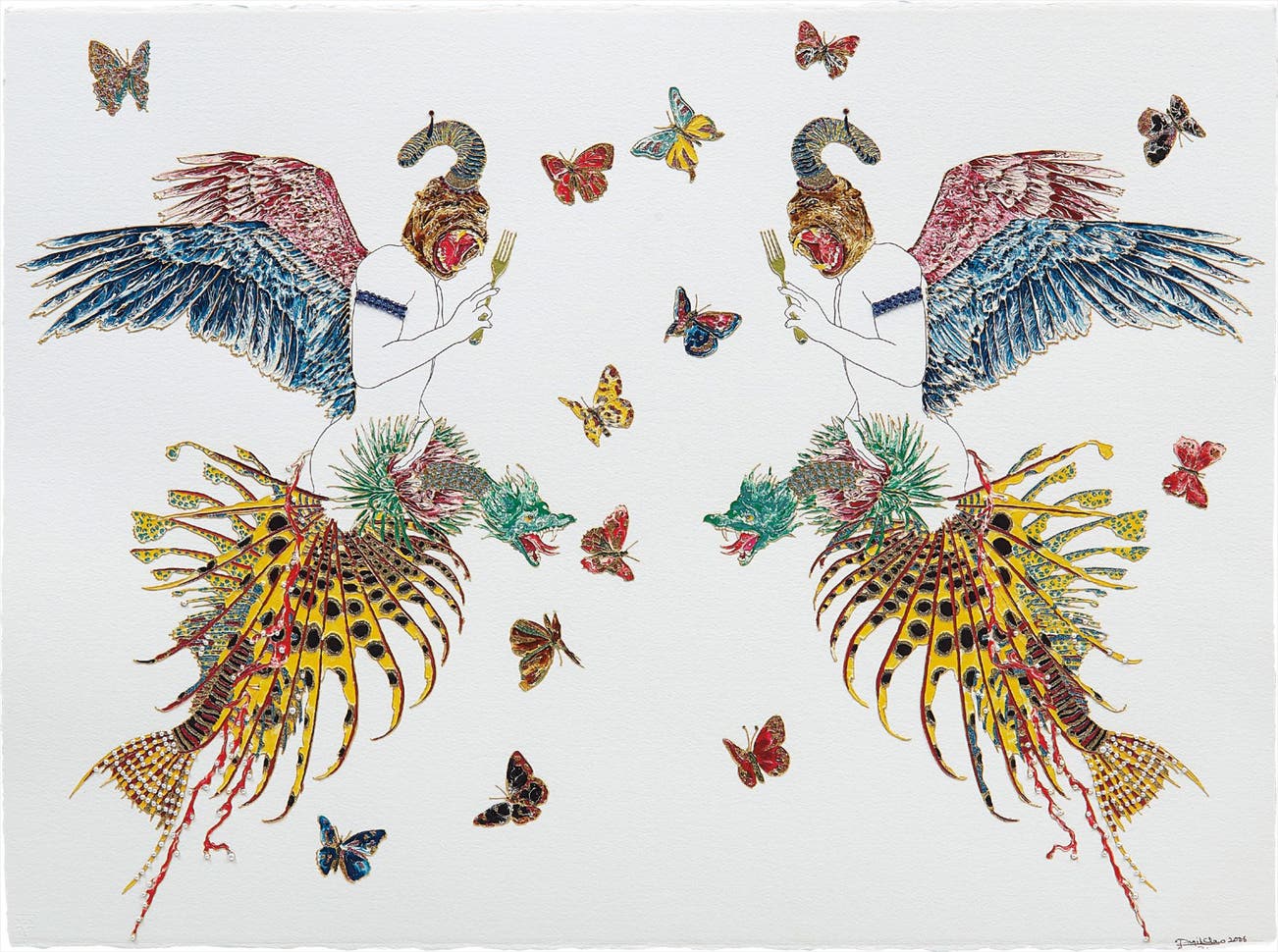 stain glass relief, automobile paint, glitter, rhinestones, crystals and synthetic beads on paper