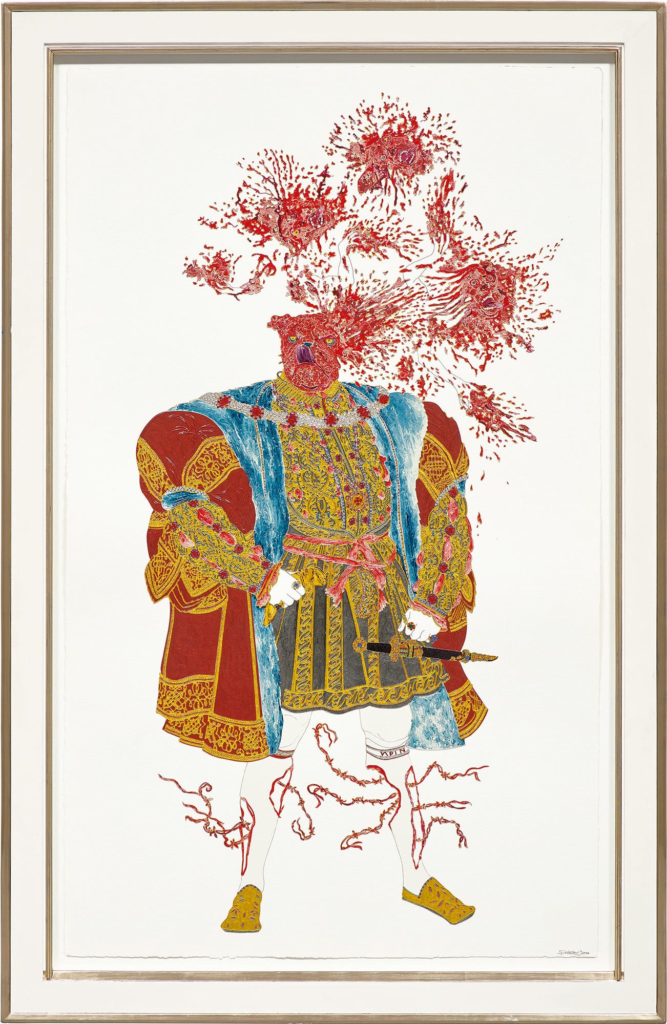 acrylic, glitter, enamel, rhinestones and mixed media on paper, in artist's chosen frame