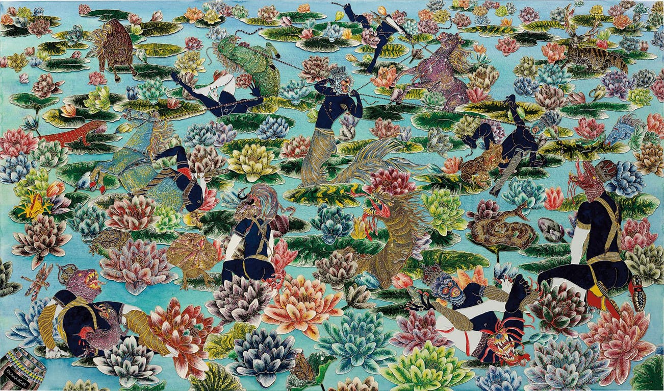 Signed, titled and dated 'Raqib Shaw "The Mild-Eyed Melancholy of The Lotus-Eaters II' 2009 on the reverse. Further Signed and dated 'Raqib Shaw 2009' on the reverse.