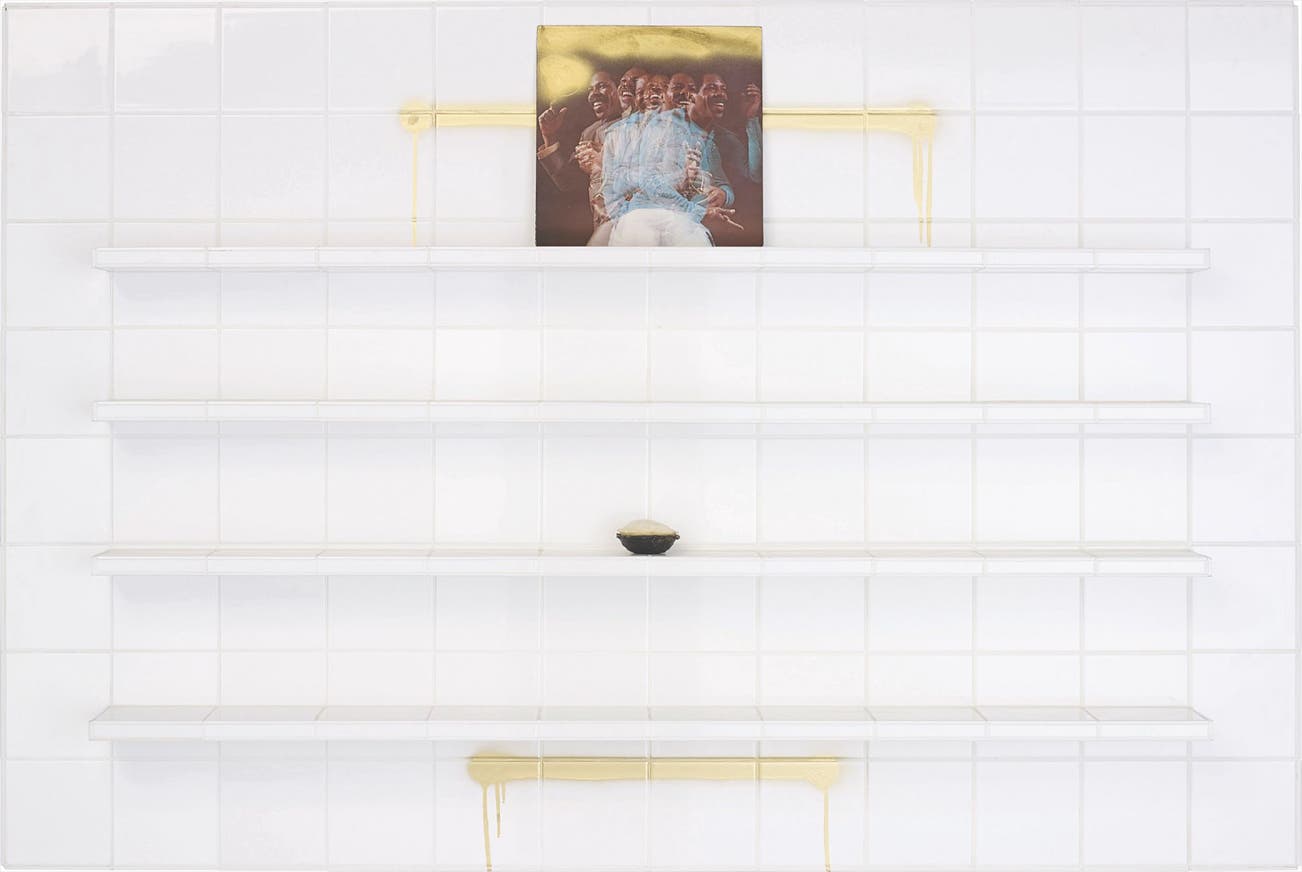 ceramic tiles, gold spray paint, shea butter and vinyl lp in sleeve