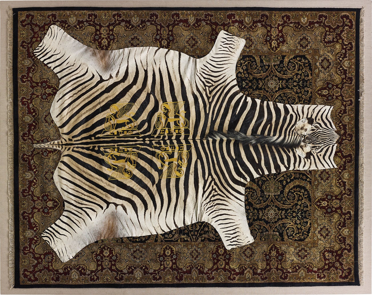 embroidered zebra skin and carpet mounted on linen