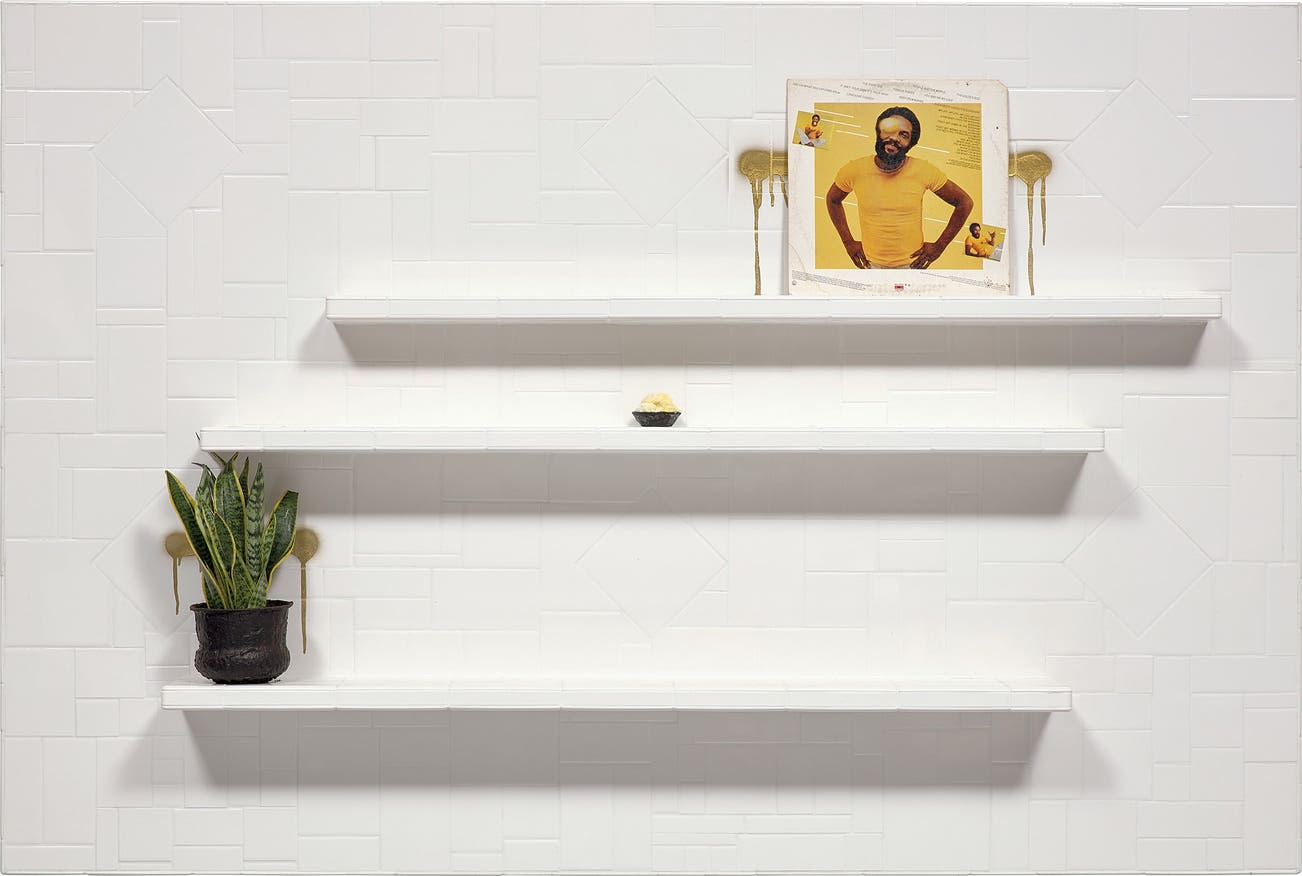 white cream tile, vinyl cover, shea butter, paint and plant