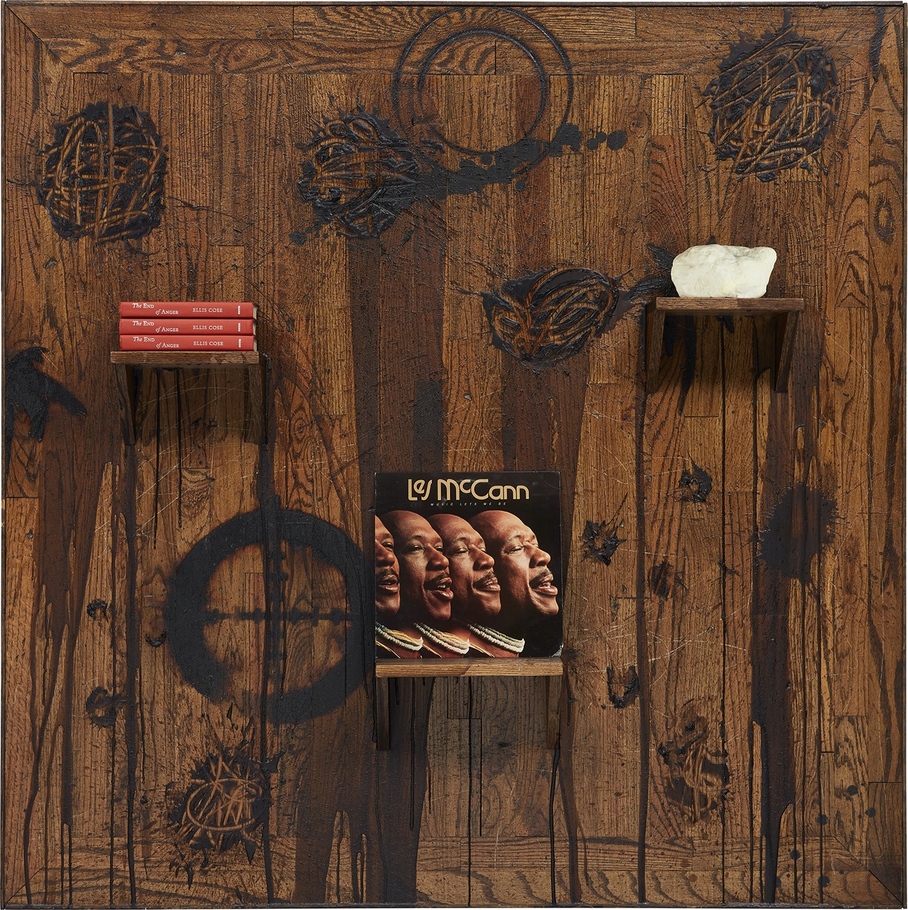 branded oak flooring, black soap, wax, books, shea butter and vinyl
