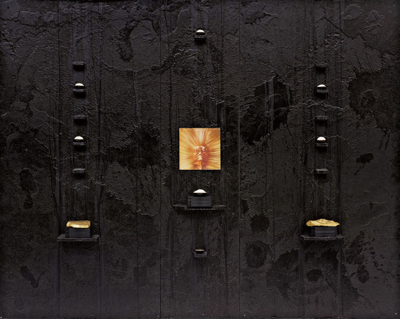 Skillfully incorporating commonplace objects from his childhood, Sun Goddess, 2009, is testament to Rashid Johnson’s desire to both confront ingrained ways of thinking about black experience, and accentuate its plurality. He transforms ordinary materials such as shea butter, wax, and record albums into conceptually and visually stimulating works of art, exploiting these resources precisely for their myriad of cultural signifiers and metaphorical representations. The present lot is characteristic of this practice– a process which the artist describes as “hijacking the domestic”– as it successfully epitomises Johnson’s exploration of the physicality of his materials in order to investigate the complexities and contradictions that comprise black identity. Though drawn upon from the artist’s own individual experience, the piece simultaneously evokes shared references that are significant to the mass of African-American culture – the use of shea butter, for example, derived from the African Shea tree, hints at the lapsed Afro-centrism of his parents, which in doing so, humorously questions the concept of applying “Africanism” to one’s body.