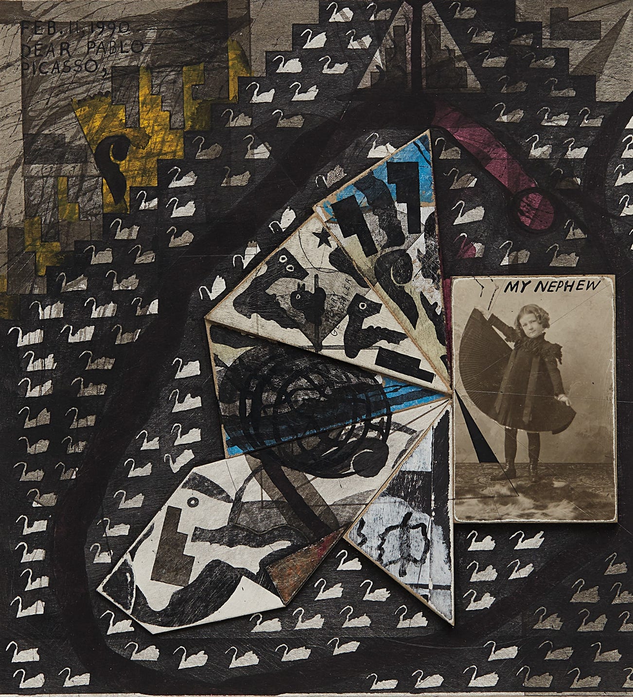 dedicated and dated "FEB. 11, 1990 DEAR PABLO PICASSO" upper left; further titled "MY NEPHEW" center right; further stamped by the Ray Johnson Estate and numbered "11789" on the reverse