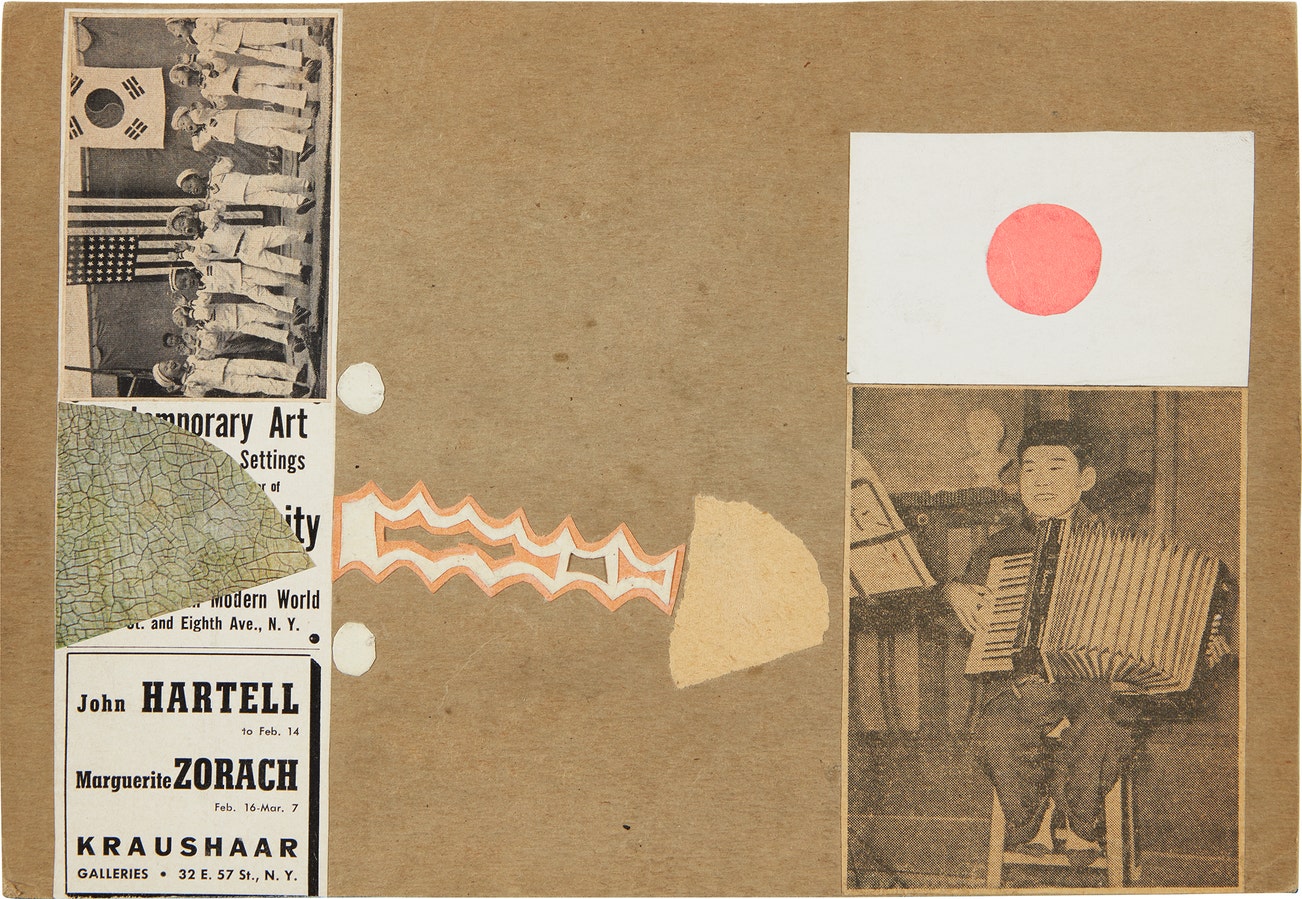 collage and printed paper collage on cardboard