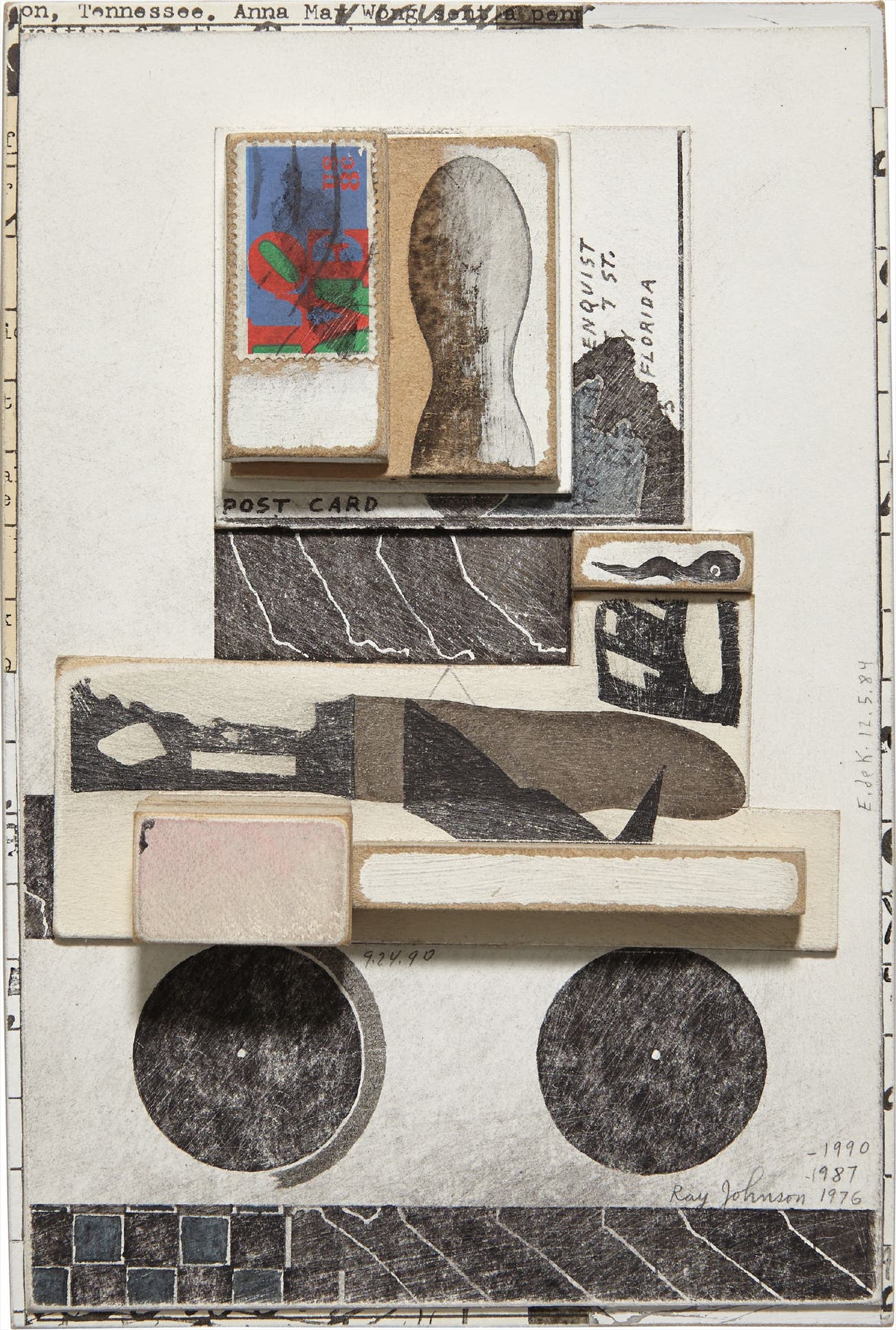 signed, dated `1976 -1987 -1990' in pencil, with the Estate of Ray Johnson stamp on the reverse of the frame and inventory #10645, framed.