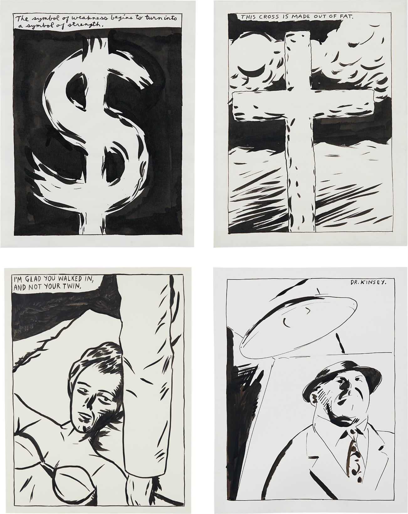 Four Works: (i) The Symbol of Weakness Begins To Turn Into A Symbol of Strength (ii) I'm Glad You Walked In, and Not Your Twin (iii) This Cross Is Made Of Fat (iv) Dr. Kinsey