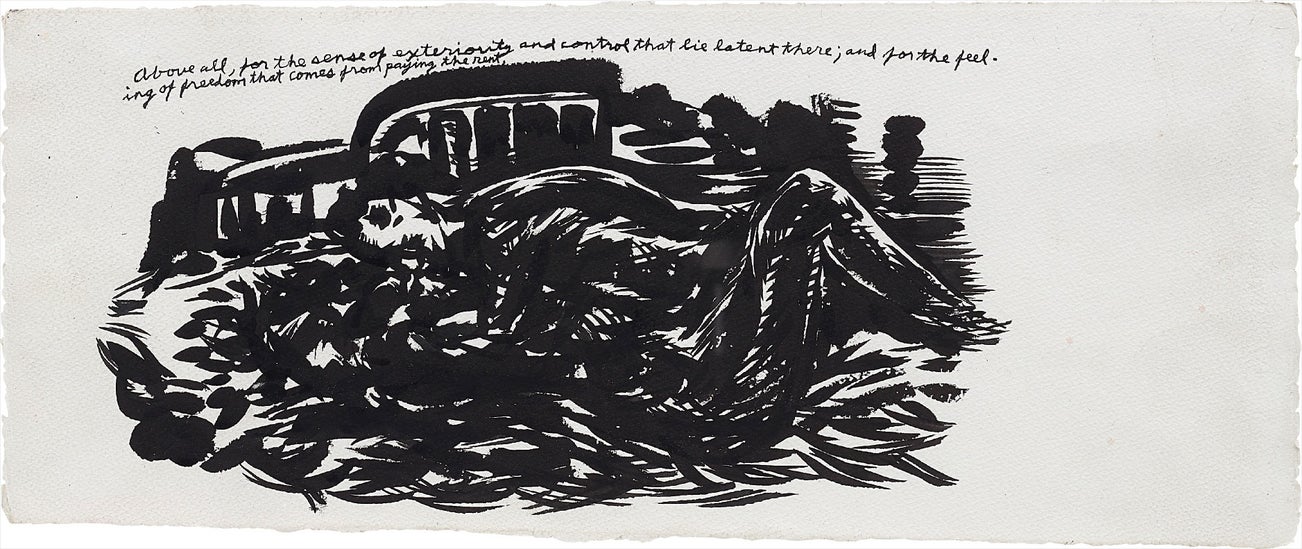 With the opening of his landmark exhibition, Raymond: Pettibon: A Pen of All Work, in February 2017 at the New Museum, New York, Raymond Pettibon’s celebrated graphic works have been the focus of recent critical acclaim on an international platform. Cementing his profound exploration into the dynamics of text and image, Pettibon’s nuanced understanding of connotative linguistic devices and evocative imagery has resulted in his distinct aesthetic and iconic visual syntax, evident throughout his prolific oeuvre. Commencing his graphic work in the sixties, Pettibon’s aesthetic encapsulated the confrontational and disaffected spirit of youth culture, specifically that of the Californian Punk scene. Working on zines, adverts and designing infamous album covers and posters for the band Black Flag, Pettibon’s witty, satirical and brash style courses with vital energy, incorporating a myriad cultural references. The present works are exemplary of Pettibon’s complex collaging of cultural narratives and associations, offering a biting critical reading of American history and culture.