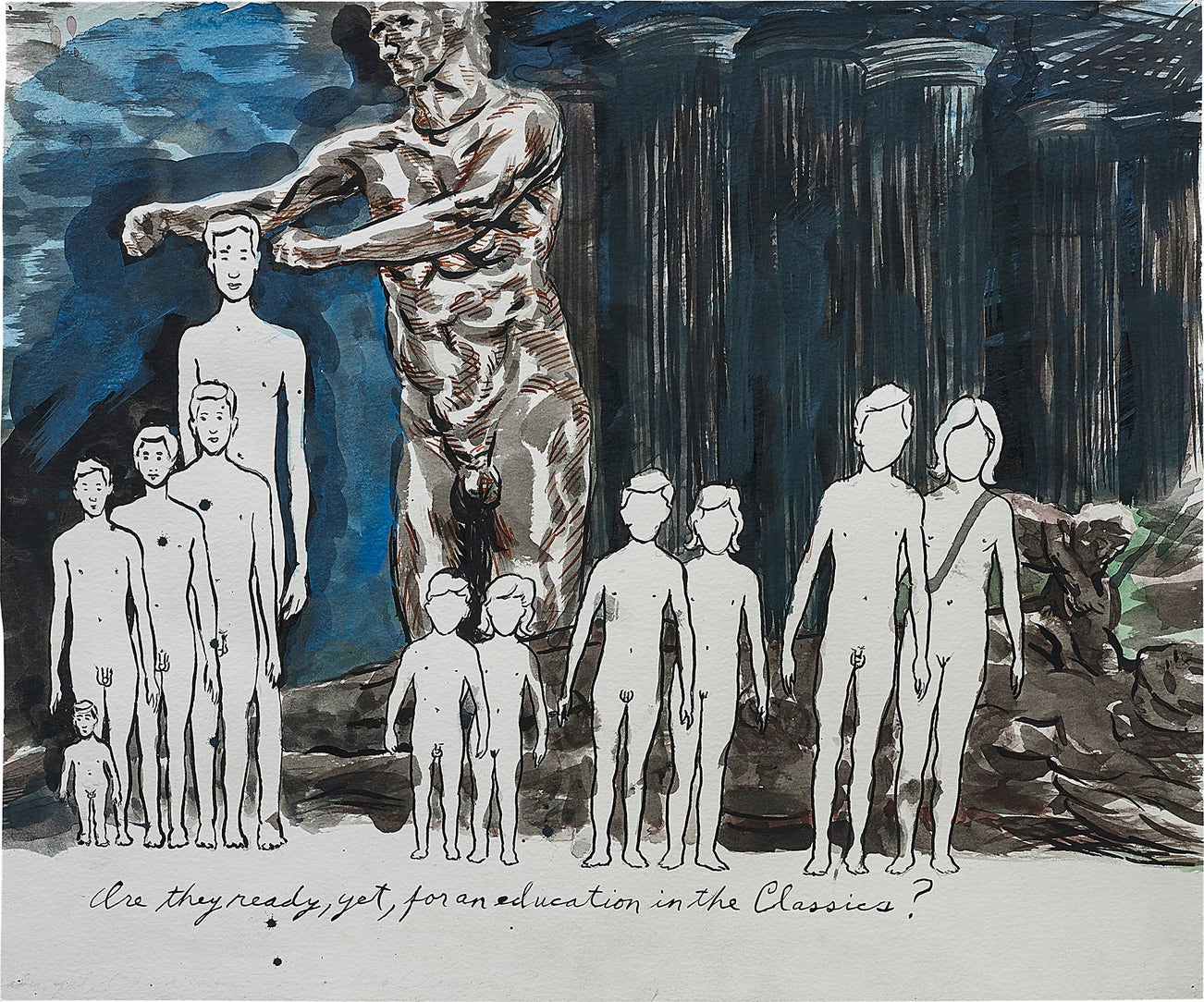 titled and indistinctly inscribed 'Are they ready, yet, for an education in the Classics? ready, yet, for an education in the Classics?' lower edge; signed and dated 'Raymond Pettibon 2003' on the reverse