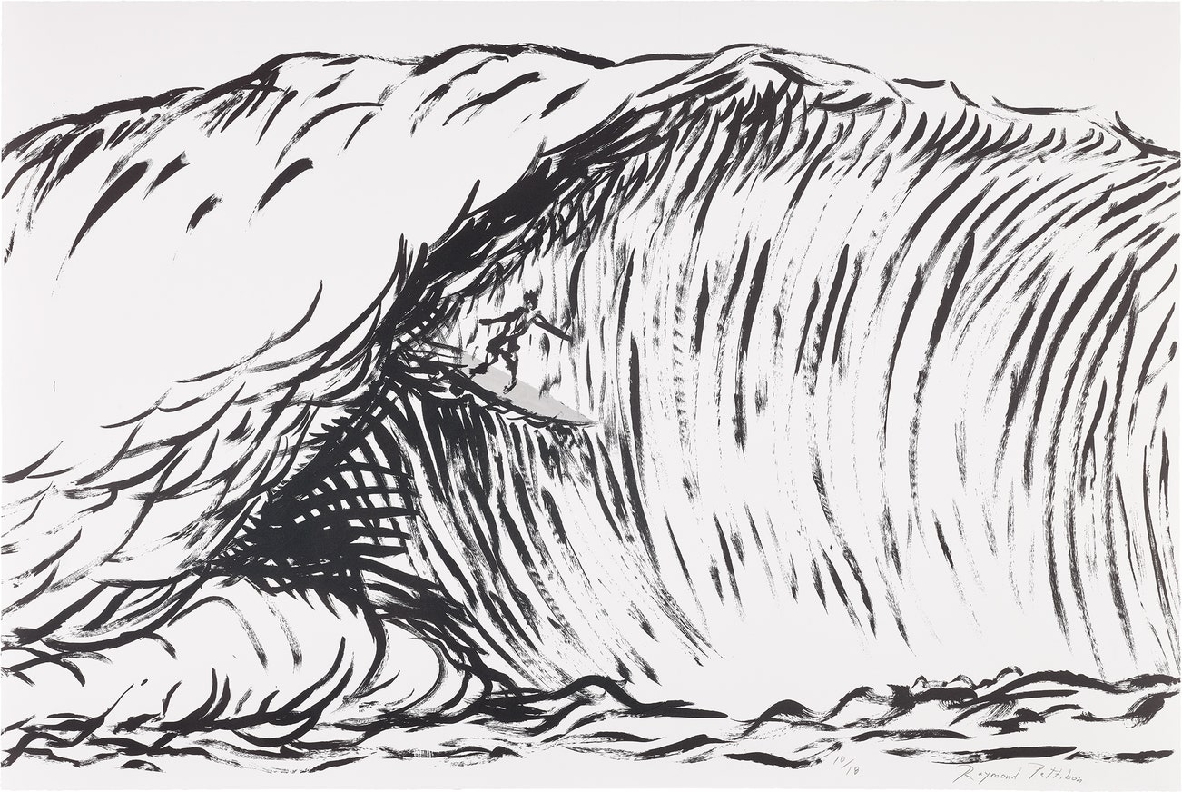 Monumental lithograph with hand-coloring in grey wash on the surfboard, on Saunders Waterford paper, the full sheet.