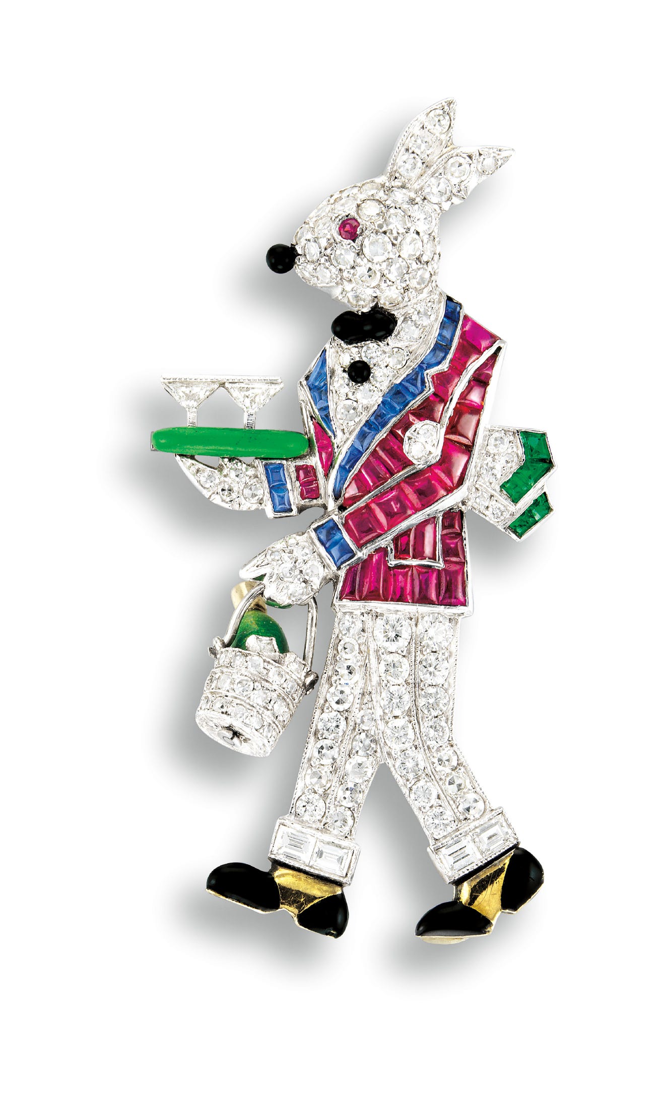 Calibré-cut rubies and sapphires on jacketSingle-cut diamonds totalling 1.10 caratsBlack enamel nose, bow tie, shirt button and shoes, embellished by a diamond-set champagne bucket and a green enamel champagne bottlePlatinum and 18 karat yellow gold