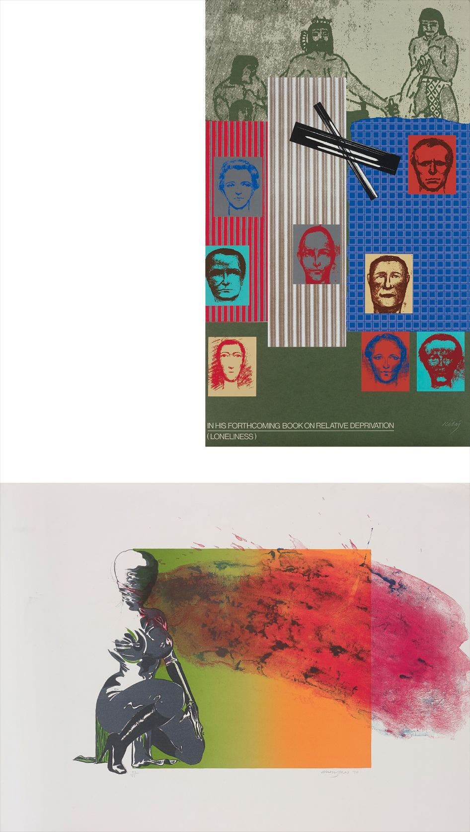 the Kitaj set each signed and numbered 4/70, published by Kelpra Studio, London (with their ink stamp), the Jones both signed and dated ‘67’ and ‘70’, the lithograph numbered 48/75 in pencil, published by Editions Alecto London (with their ink stamp) and Petersburg Press, London, respectively, all 10 unframed.