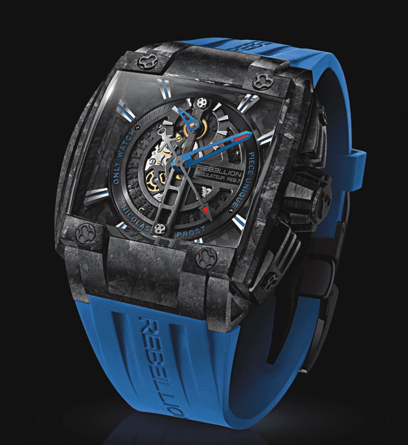This specific unique piece, forged carbon REB-7, was worn by professional racing driver, Nicolas Prost during the famous 24 Hours of Le Mans endurance race in 2015. Its strength has been tested during this legendary 24-hour race, which is also known as the Grand Prix of Endurance and Efficiency. The bright blue on the dial and the strap comes from the colors on Nicolas Prost's helmet. In 2015, the Rebellion’ team was victorious in LMP1 in the private team category.