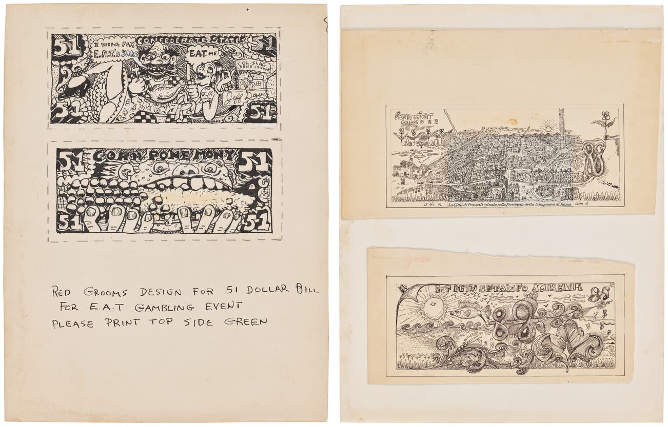 The Red Grooms inscribed 'Red Grooms design for 51 dollar bill, for E.A.T. gambling event, please print top side green' in black ink, executed in the United States, both unframed.