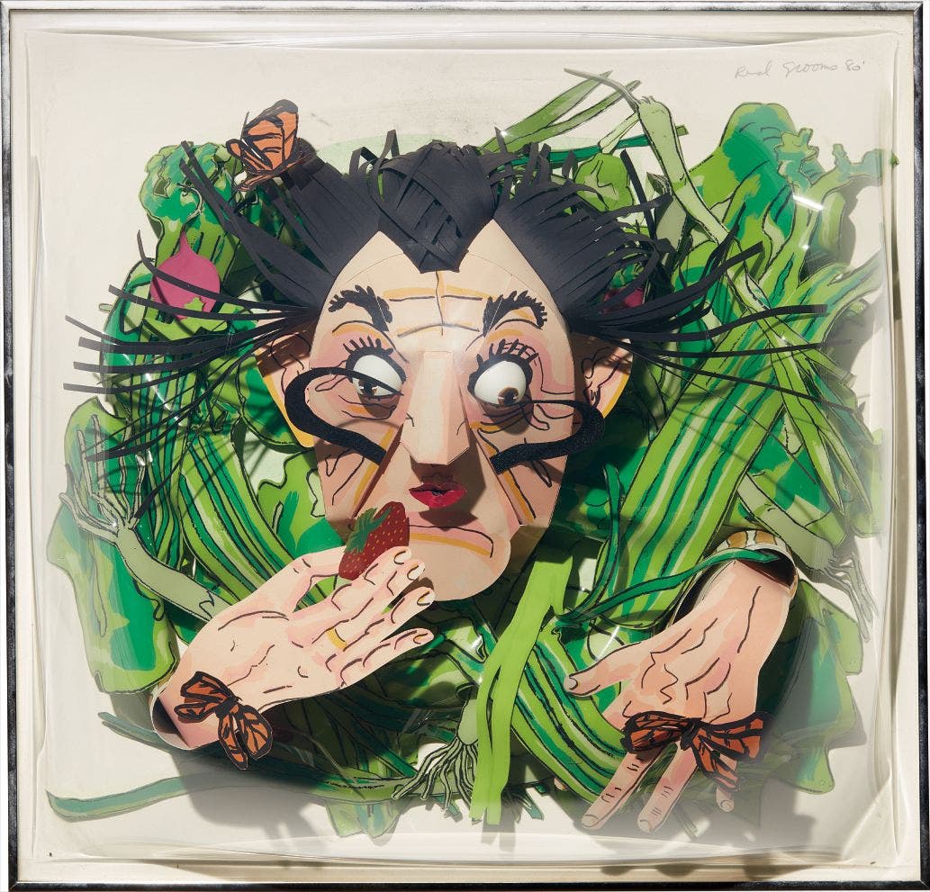 For this remarkably complex project, Grooms used fresh vegetables he purchased at a Minneapolis supermarket as the models for his salad ingredients, which were recreated as screenprints on vinyl. Painted ping pong balls were used for Dali's intense gaze.