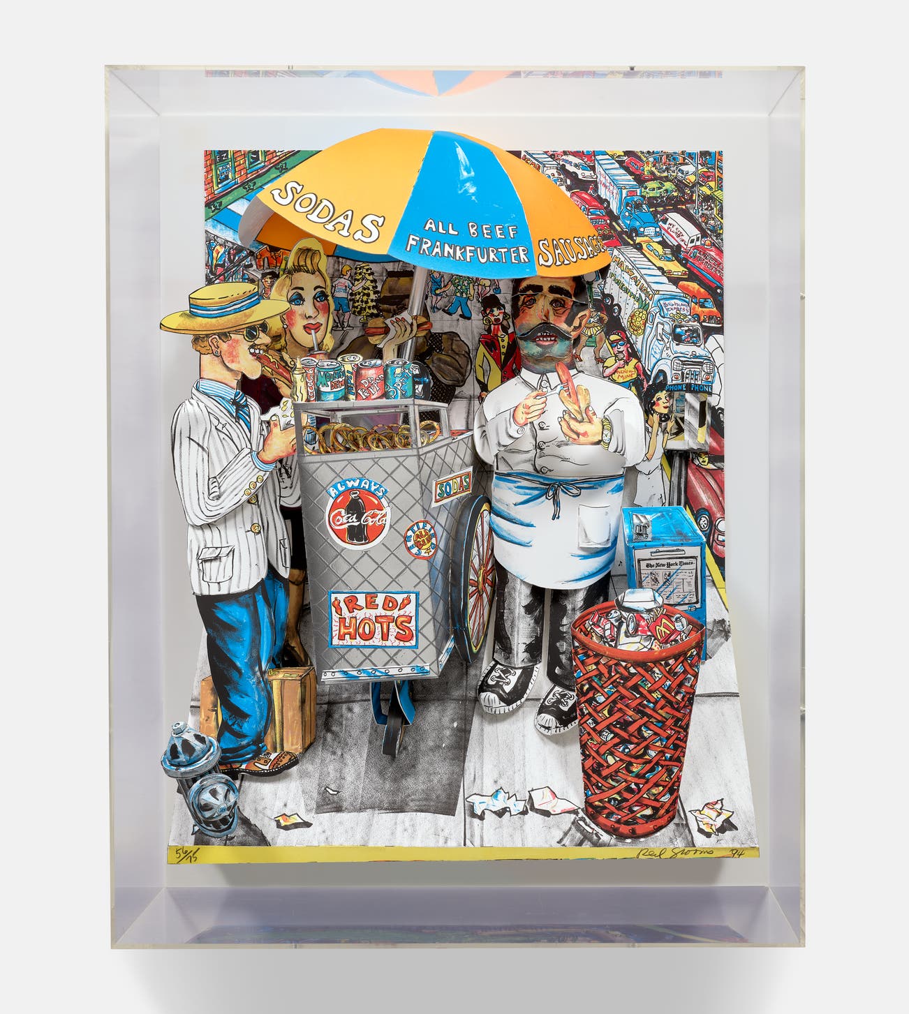 Three-dimensional lithograph and linocut in colors with aluminum foil Chine collé and cut-outs, on Rives BFK paper, glued and mounted in a Plexiglas case (as issued).