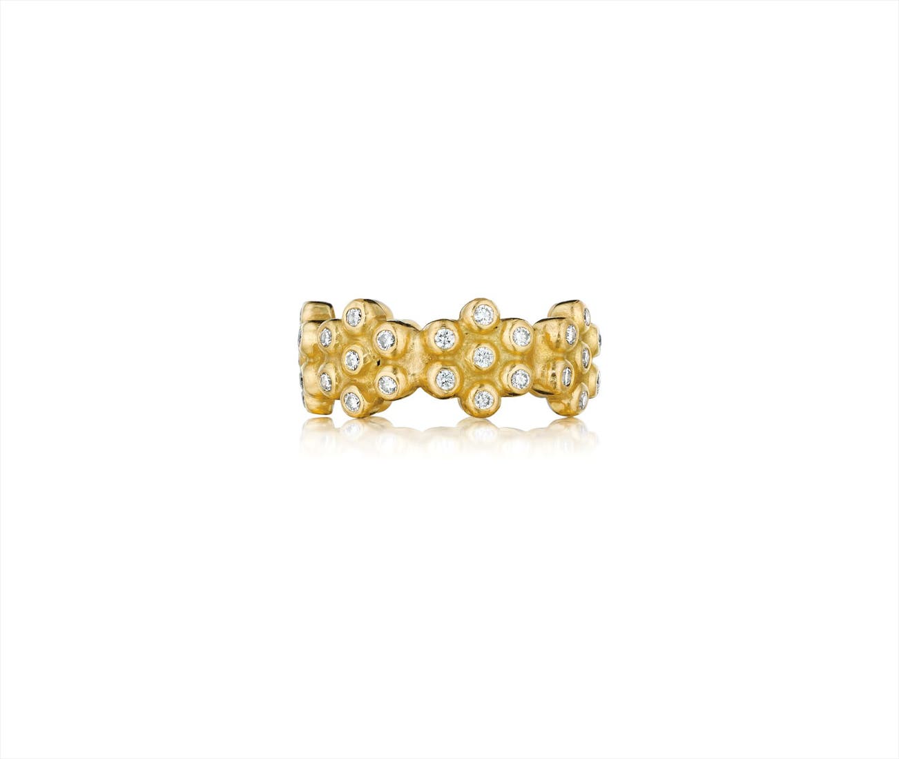 Designed as a series of seven clusters of circular-cut diamonds, mounted in 20K yellow gold, size 4 1/2.