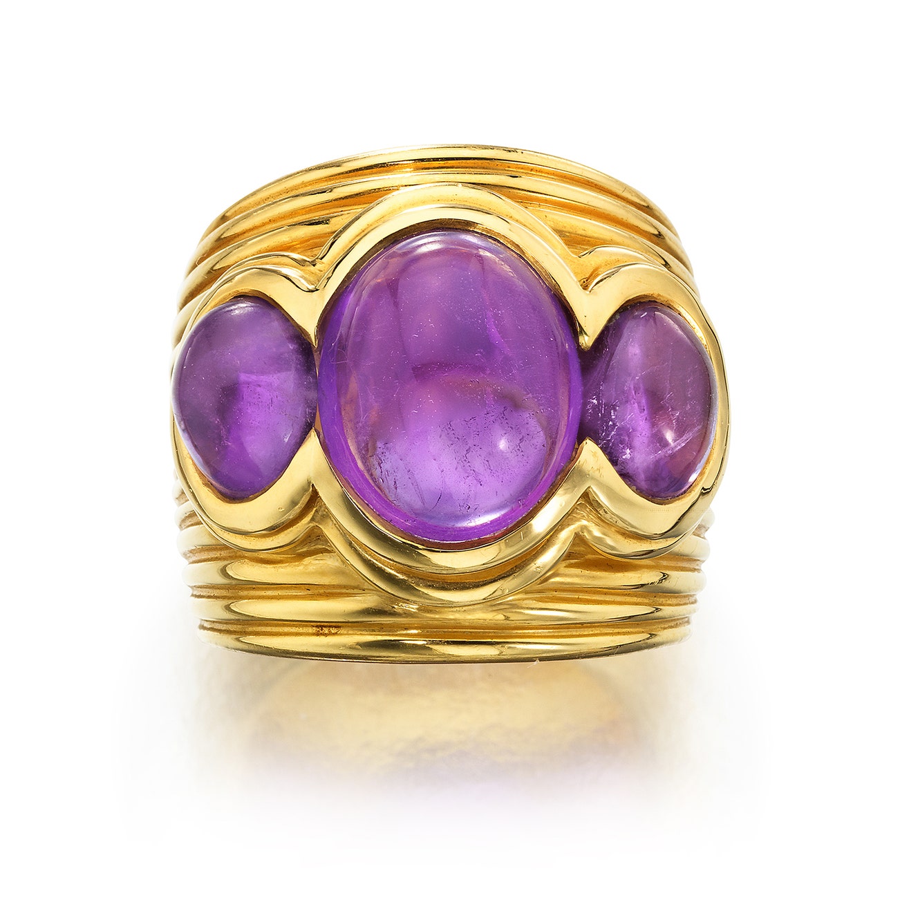 Set with three oval cabochon amethysts, mounted in 18k yellow gold, size 5.25, Signed René Boivin, French assay mark for 18k gold and maker's mark.