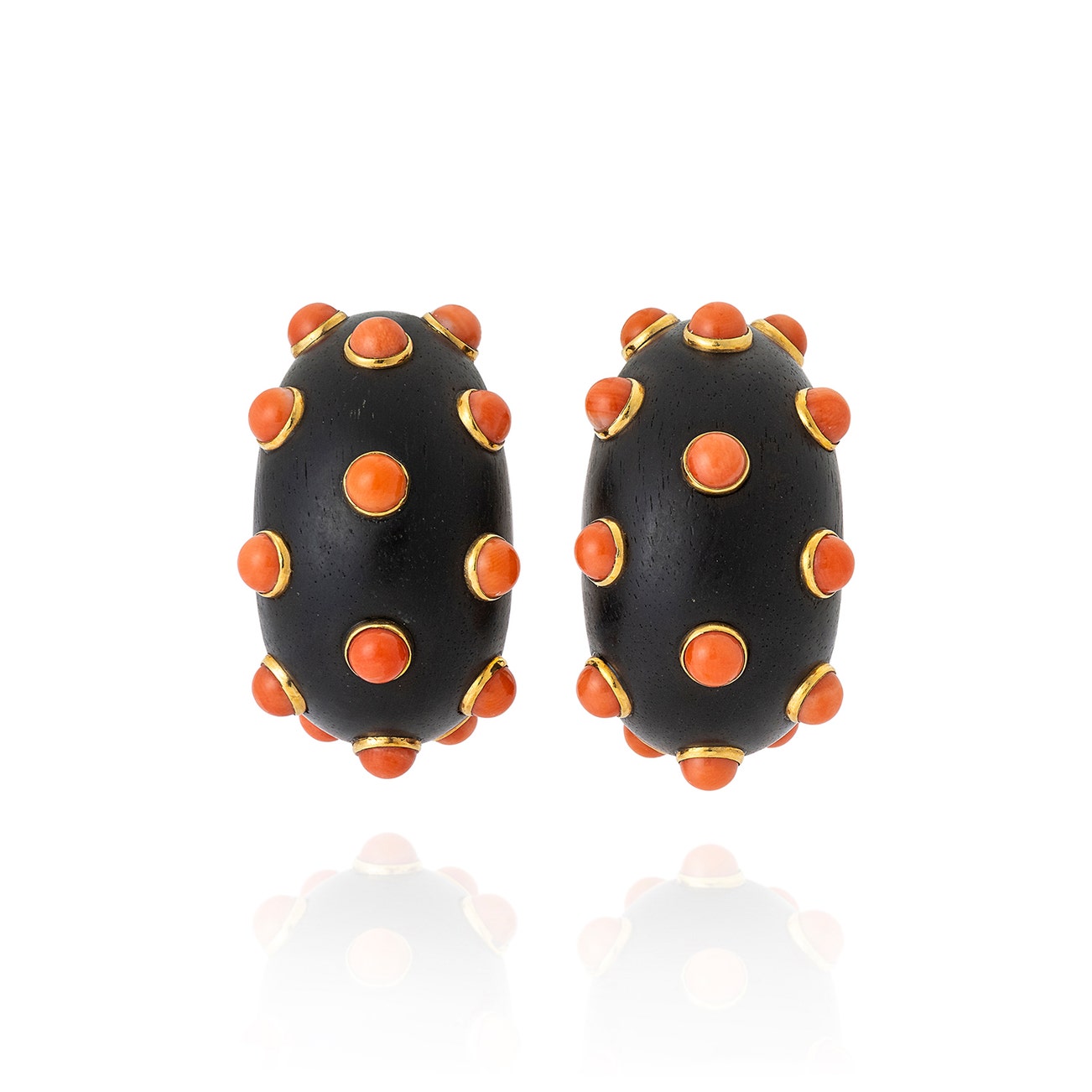 Of bombé design, the wood applied with coral cabochons, measuring approximately 33 x 19mm, each signed René Boivin, French maker's marks for Société René Boivin and assay marks for gold.