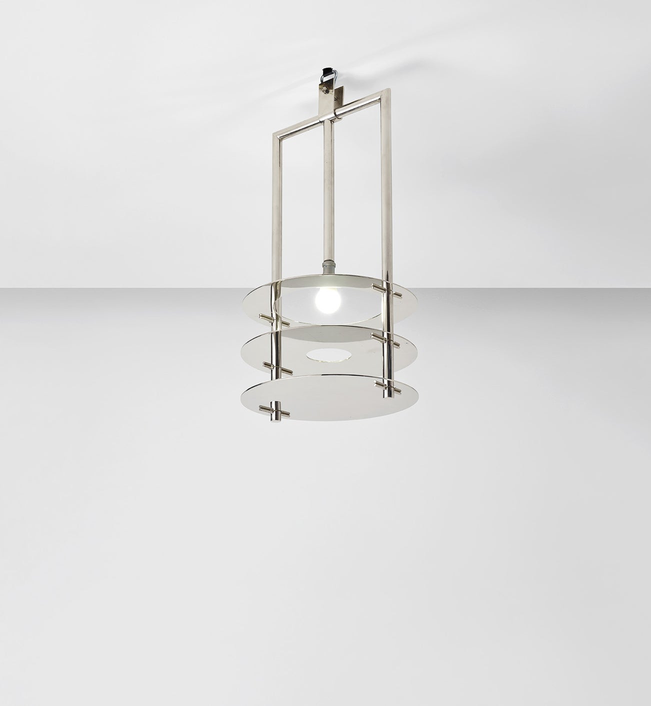 Comprising a nickel-plated tubular steel frame with three affixed discs and central exposed bulb, the present ceiling light by the French architect and designer René Herbst demonstrated a new visual language made possible through modern materials. A pioneering figure within the modern movement, Herbst was among the first designers in France to use tubular steel in his furniture designs, which he sought to adapt to serial production in order to improve standards of living. Herbst proposed two principles for serial production: the technical, in which the machine offered the designer the economic and perfect realisation of each element of the utilitarian object; and the aesthetic, explaining that when each element and the resulting form are produced with flawless technique to correspond exactly to their functions, the object will be pure and beautiful. Herbst opposed the idea that serial production would lead to furniture of inferior quality, instead advocating for the use of high quality materials to create objects that would last. Further humanising technological innovation, Herbst made reference to how series of forms were commonplace in nature, and that the machine was the creation of the human brain and hands.
