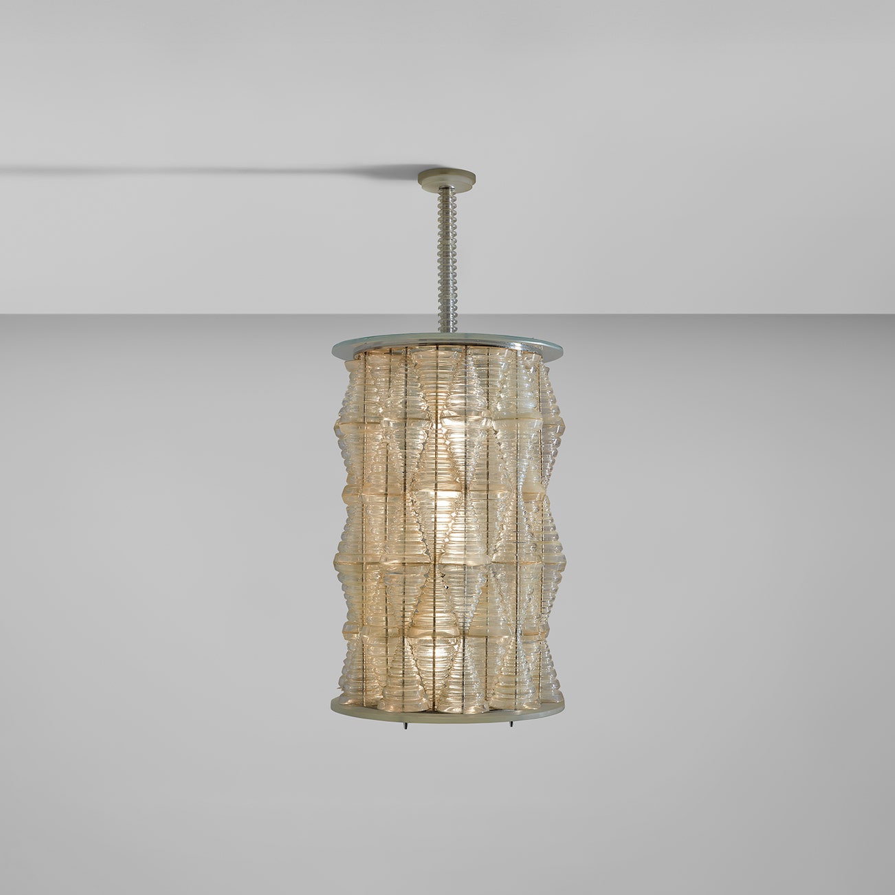 Mold-blown glass, frosted glass, nickel-plated steel.