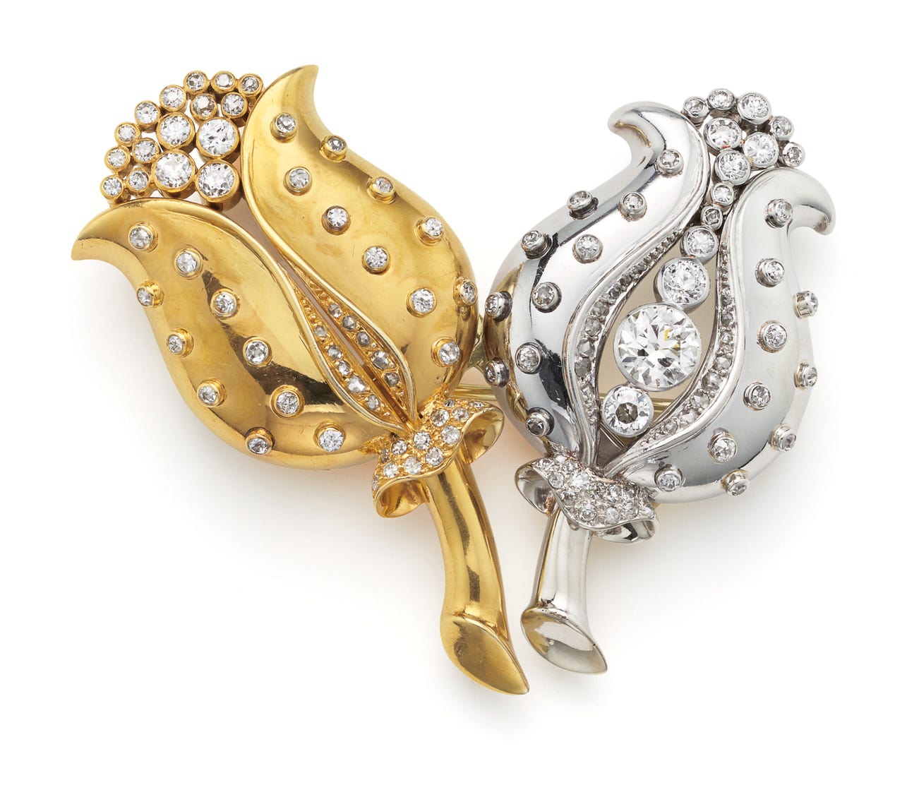 A Diamond and Gold Double Clip 'Tulip' Brooch