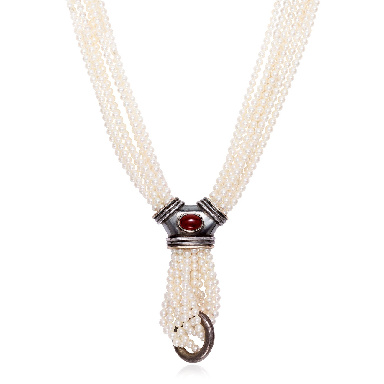 Comprised of seven strands of cultured pearls, affixed with a slider pendant set with a carnelian cabochon, mounted in silver with gold accents, length up to approximately 32 inches, signed R. Boivin with French assay marks for gold and silver.