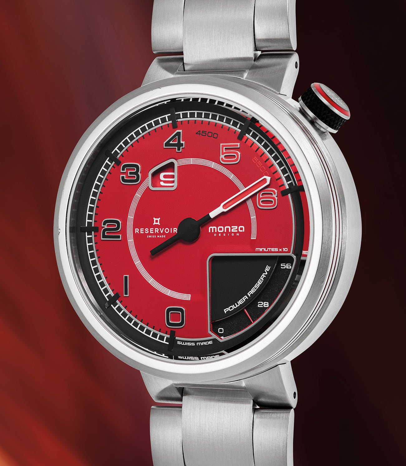 The collaboration RESERVOIR by MONZA Design seamlessly blends the spirit of the racetrack with the intricacies of watchmaking. Drawing inspiration from the adrenaline-fueled world of sportscar racing with a prancing horse, this wristwatch is a tribute to speed and precision.