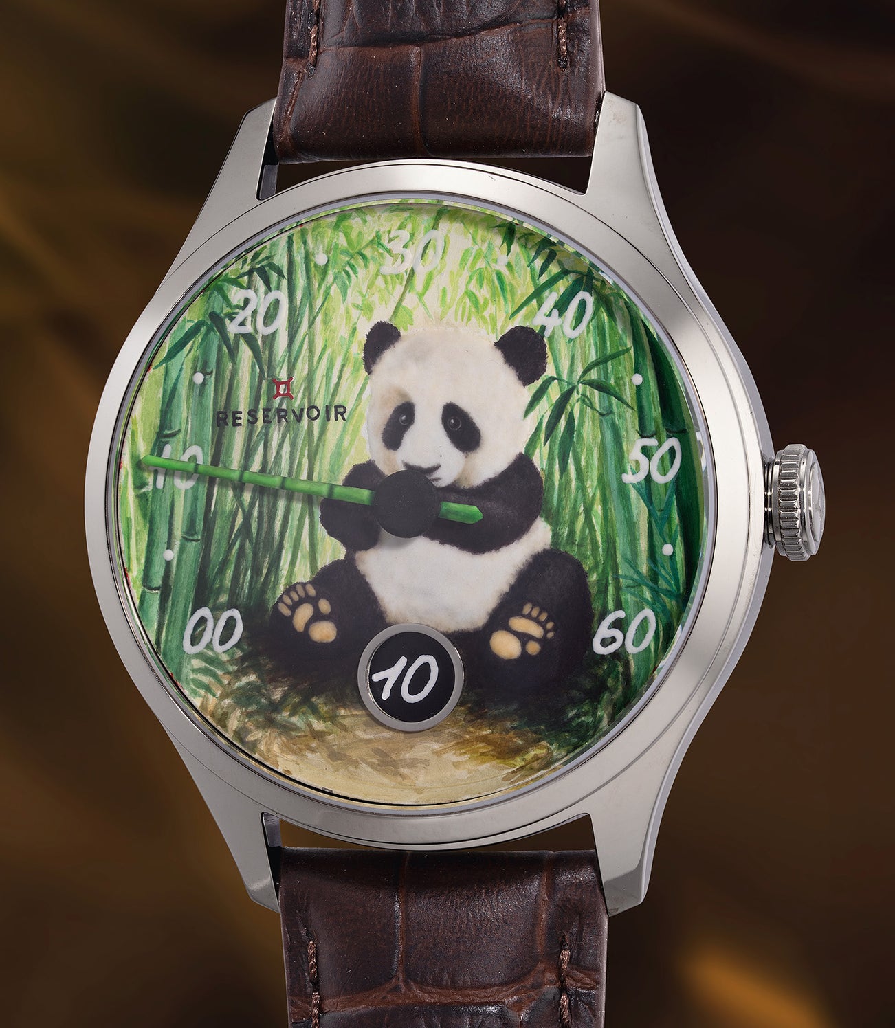 Renowned artist Philippe Jacquin-Ravot brings charm and vitality to the present piece-unique, “The Panda Edition”. The dial captivates with the artist’s masterful brushwork depicting a hand-painted panda within a lush bamboo forest, while RESERVOIR’s signature retrograde minute arc and jumping hour add technical intrigue. Featuring a unique hand in the shape of a bamboo branch held by the panda that sweeps across a 240° arc, the dial comes to life with each passing minute. Powered by a new in-house cal. RSV-240 with 56 hours of power reserve, collectors will be delighted to know that the panda is painted with Superluminova and will completely light up in the dark. The polished titanium case provides a modern yet understated frame for the panda’s innocent joy. Delivered in a prestigious wooden presentation box with an additional leather strap, “The Panda Edition” represents the convergence of creativity, craftsmanship and nature. Collectors will surely find this unique piece of mechanical craft a charm to wear on the wrist.
